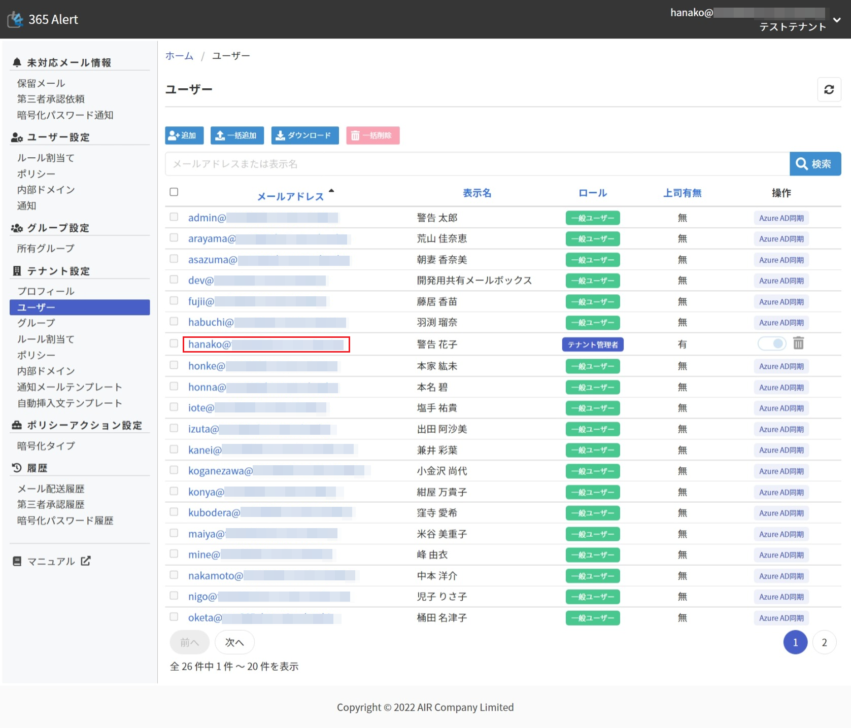2. 画面左のメニューから[テナント設定]の[ユーザー]をクリックします。