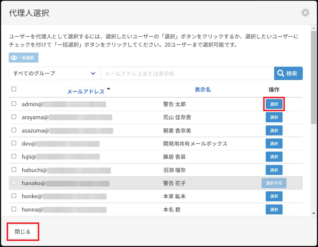 5. 以下の画面が表示されますので、対象ユーザーの代理人となるユーザーを選択し、[閉じる]ボタンをクリックします。
