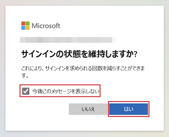 2. ポップアップでMicrosoftの画面が表示されれサインインを求められることがあります。その場合は、Outlookをご利用のMicrosoftアカウントでサインインしてください。サインイン成功後以下の画面が表示されますので、[今後このメッセージを表示しない]にチェックを付けて[はい]をクリックしてください。次回からサインインが求められなくなります。