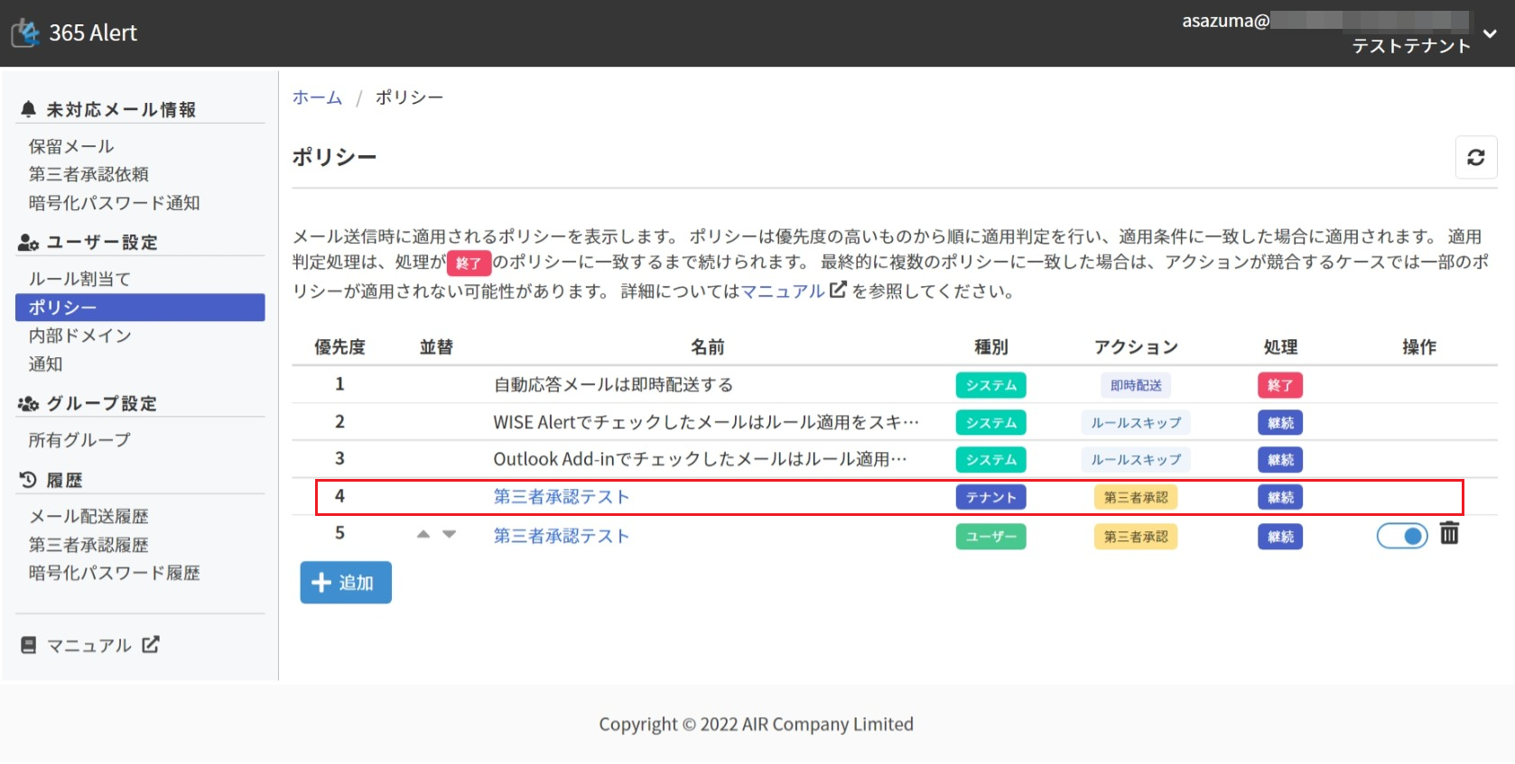 2. 以下の画面が表示されますので、[適用ポリシー]項目に、「名前 種別 アクション」の形式で表示されている適用されたポリシーの中から アクション第三者承認 の行を探し、名前種別 を取得します。