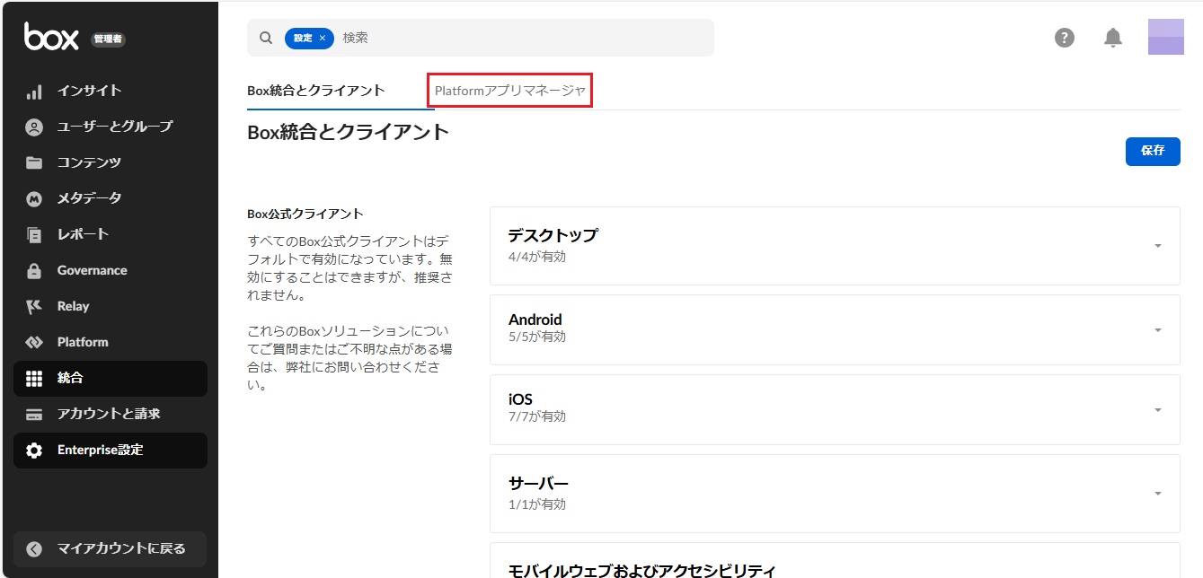 画面上部のタブから[Platformアプリマネージャ]をクリックします。