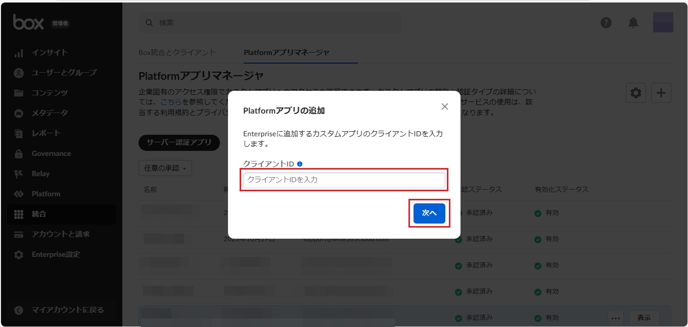 [クライアントID]に「BoxアプリクライアントID」(取得方法は下記NOTE参照)を入力し、[次へ]をクリックします。