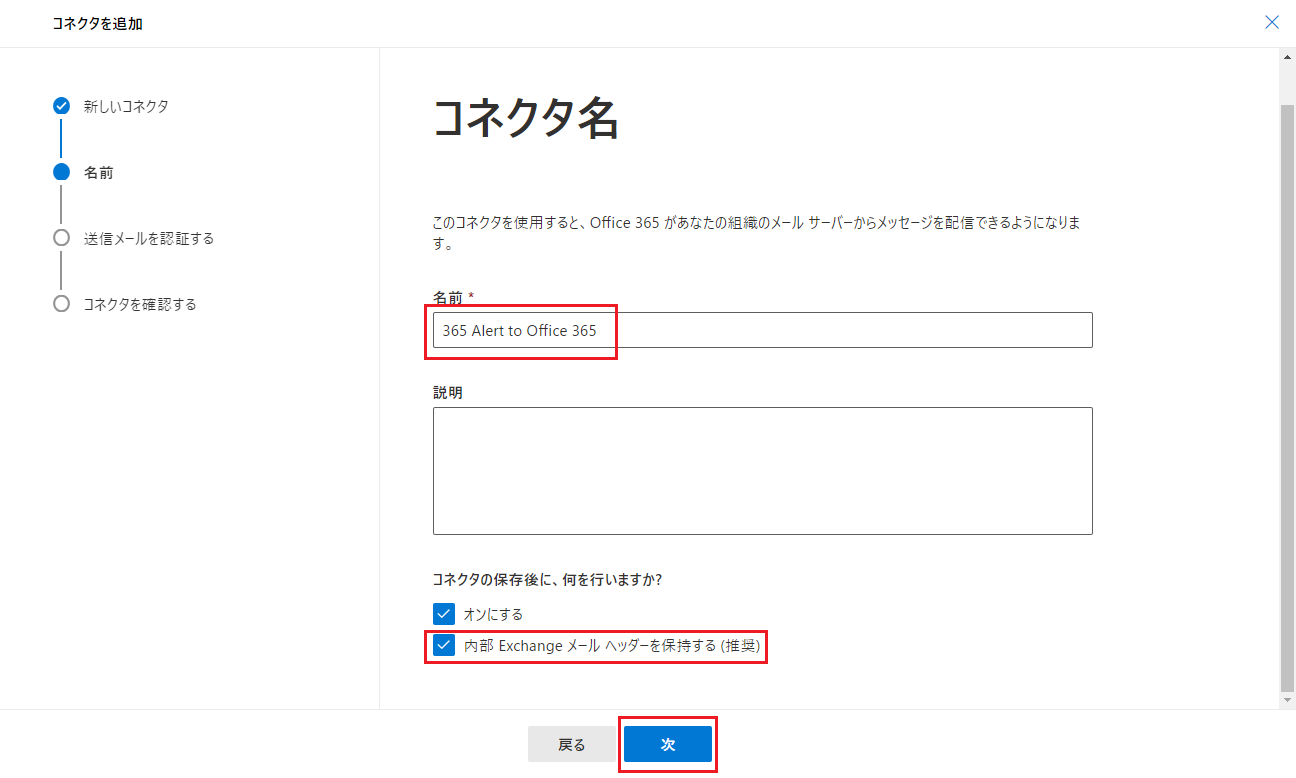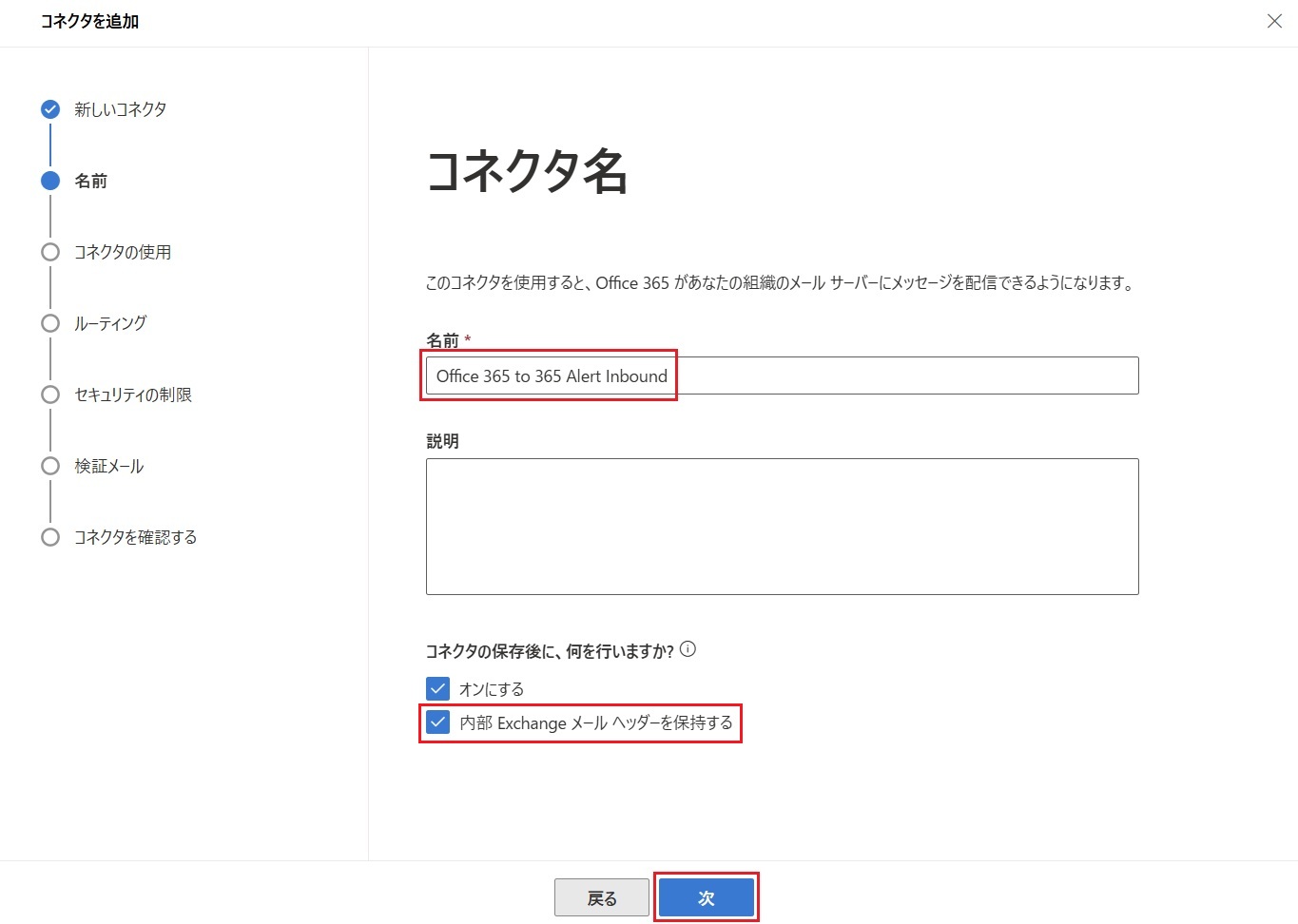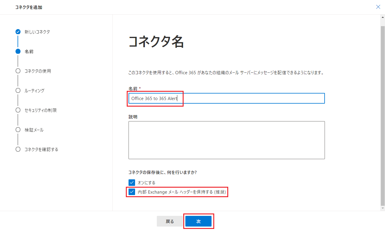 4. 以下の画面で、[名前]にOffice 365 to 365 Alertを入力し、[内部Exchangeメールヘッダーを保持する]チェックボックスにチェックを付け、[次]をクリックします。