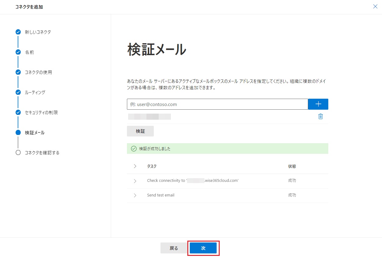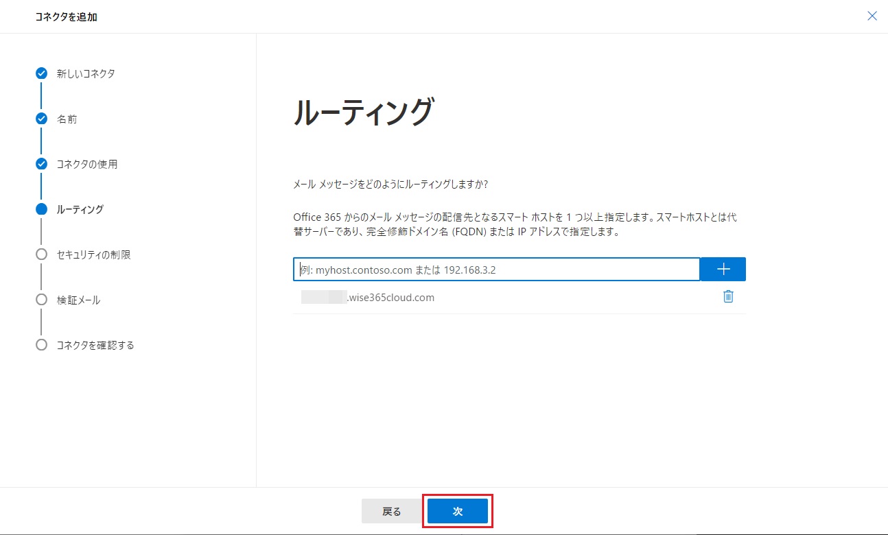 6. 表示された画面で、入力欄に「365 Alert受信用SMTPサーバー」(取得方法は下記NOTE参照)を入力し、[+]をクリックします。以下の画面が表示されたら、[次]をクリックします。