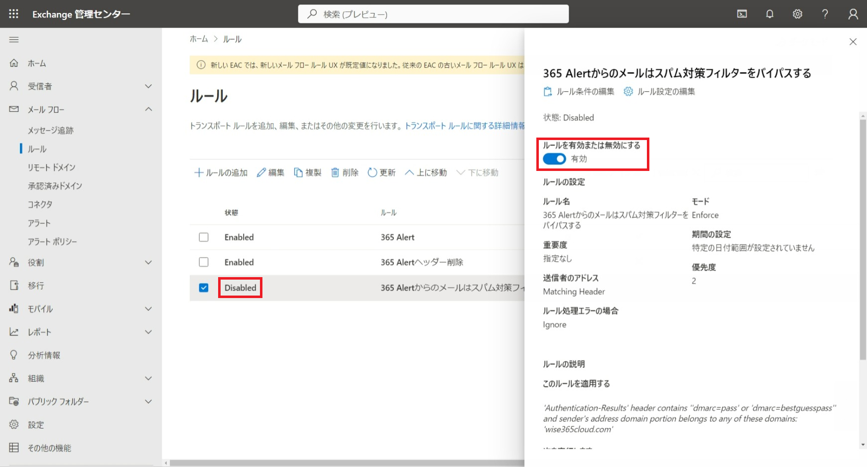 7. メールフロールールの優先度を参照して365 Alertヘッダー削除メールフロールールの優先度を調整してください。