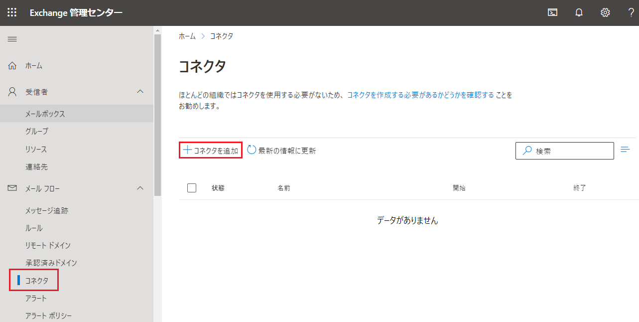 2. 画面左のメニューから[メールフロー]>[コネクタ]をクリックします。表示された画面で[+コネクタを追加]をクリックします。