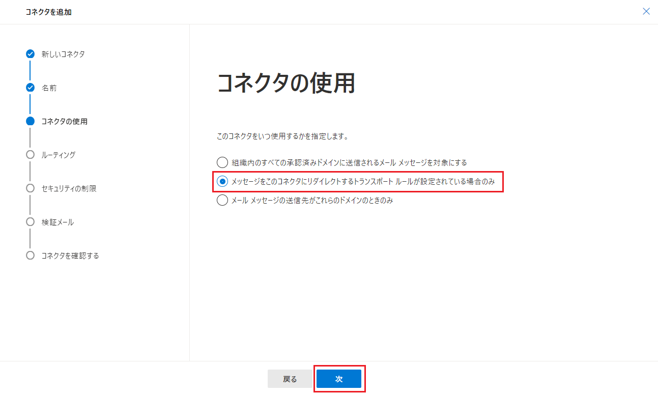 5. 以下の画面で、[メッセージをこのコネクタにリダイレクトするトランスポート ルールが設定されている場合のみ]を選択して、[次]をクリックします。