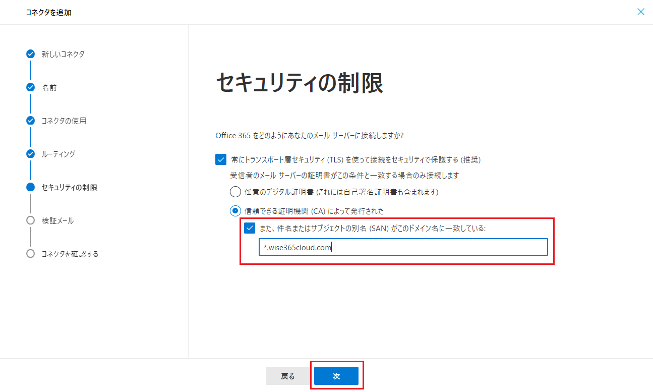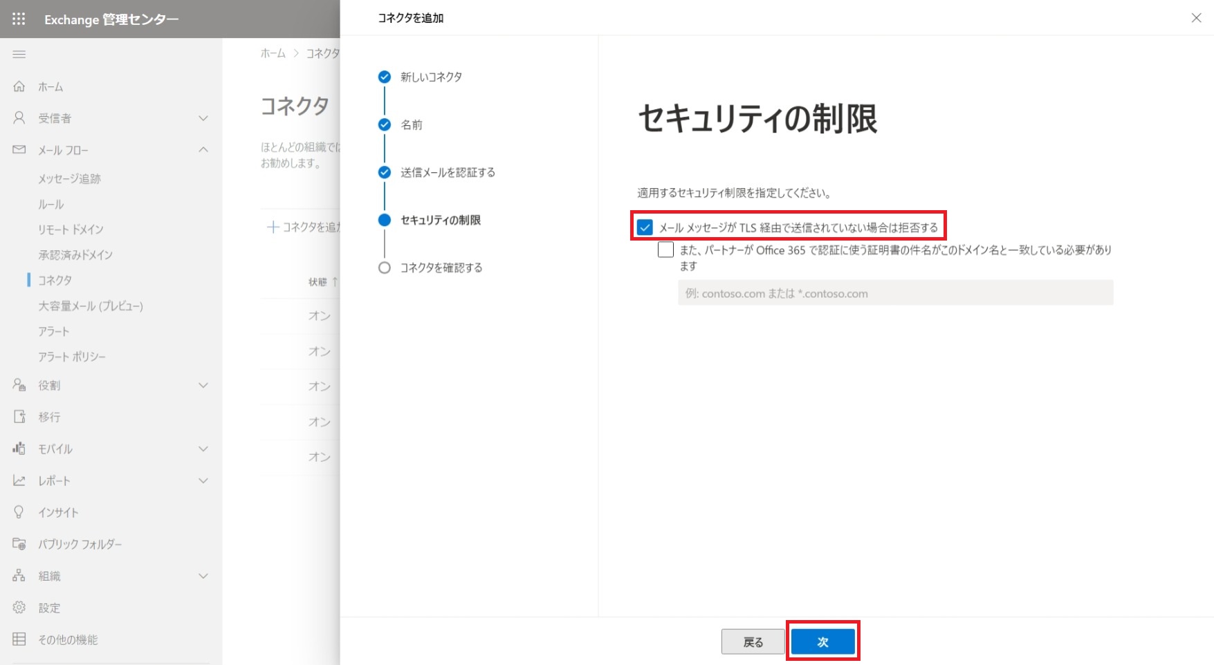 6. [メールメッセージがTLS経由で送信されていない場合は拒否する]にチェックを付け、[次]をクリックします。