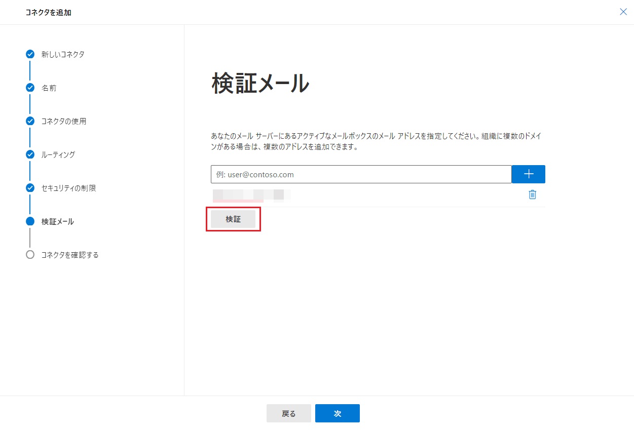 8. 表示された画面で、入力欄に、テスト用の社外ドメインのメールアドレスを入力して、[+]をクリックします。以下の画面が表示されたら、[検証]をクリックします。