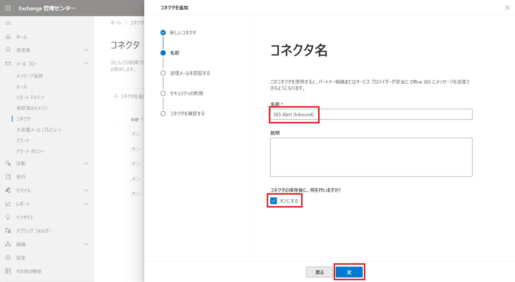 4. 以下の画面で、[名前]に365 Alert (Inbound)を入力し、[オンにする]にチェックを付け、[次]をクリックします。