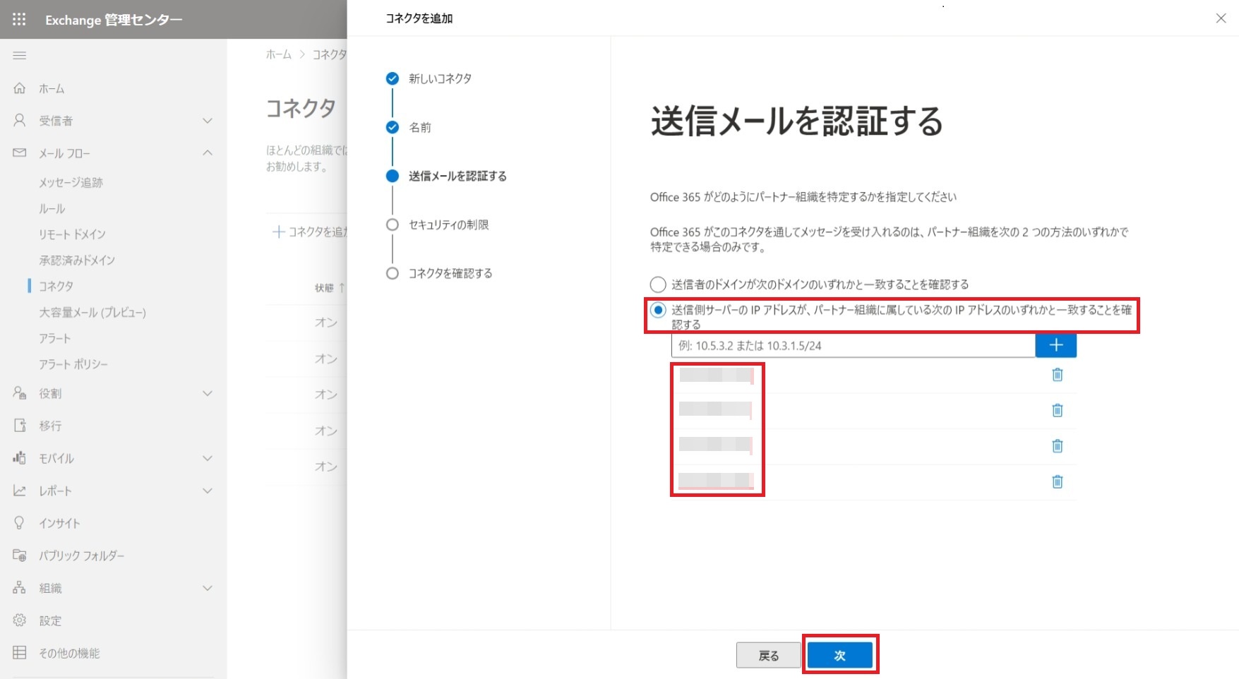 5. [送信側サーバーの IP アドレスが、パートナー組織に属している次の IP アドレスのいずれかと一致することを確認する]を選択し、入力ボックスにIPアドレスを入力し+ボタンをクリックすることを365 AlertサーバーのIPアドレス分繰り返します。[次]をクリックします。