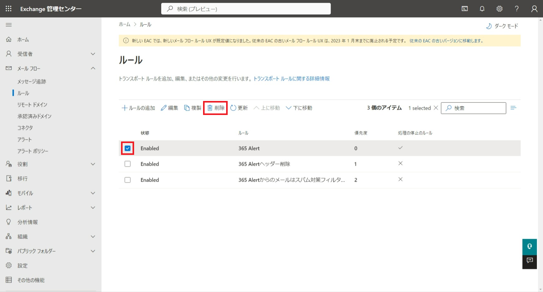 365 Alert Inboundメールフロールールはこちらの手順で作成した場合に削除してください。