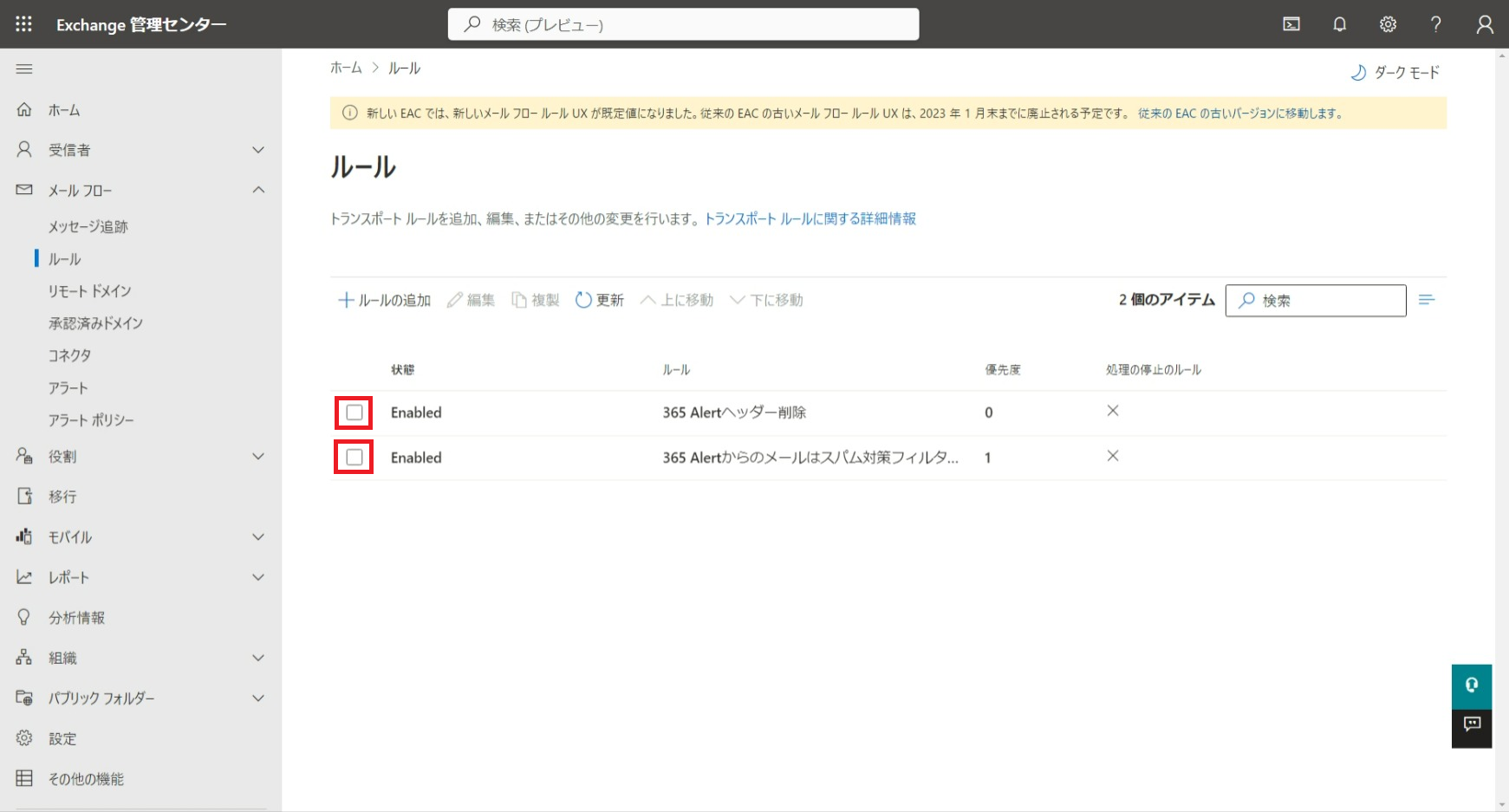 以下では、365 Alertで使用するExchange Onlineのメールフロールールとコネクタの設定を削除する手順を記載します。