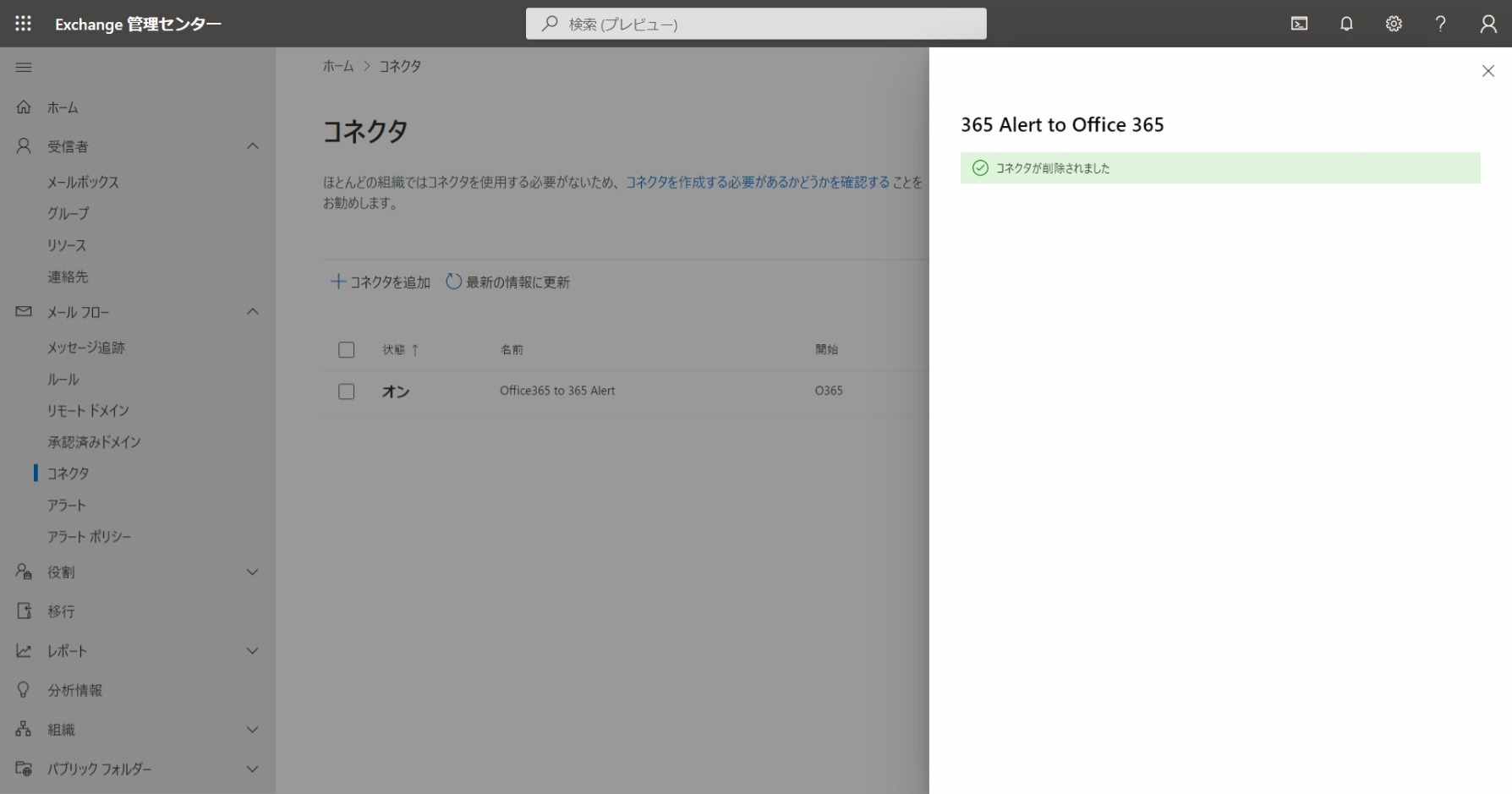6. 同様にOffice 365 to 365 Alertコネクタ(作成した場合のみ)とOffice 365 to 365 Alert Inboundコネクタと365 Alert (Inbound)コネクタ(作成した場合のみ)を削除します。
