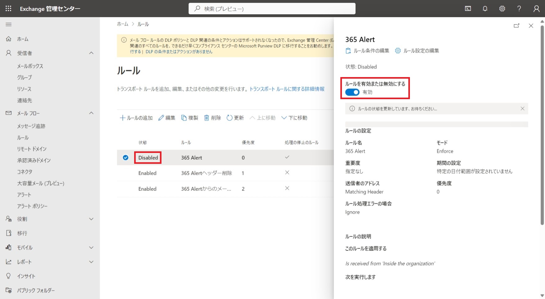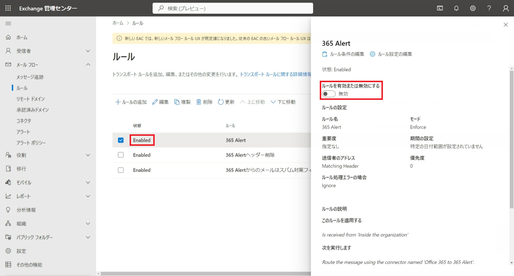 3. 365 Alertメールフロールールが有効(Enabled)になっているので、365 Alertメールフロールールをクリックして、[ルールを有効または無効にする]をクリックして無効にします。