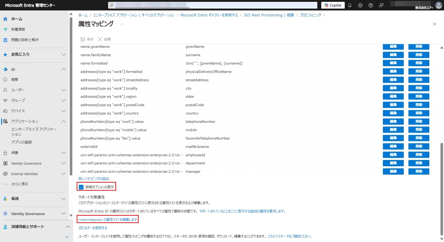 [マッピング]セクションの「Provision Microsoft Entra ID Users」リンクをクリックし[属性マッピング]画面を開きます。