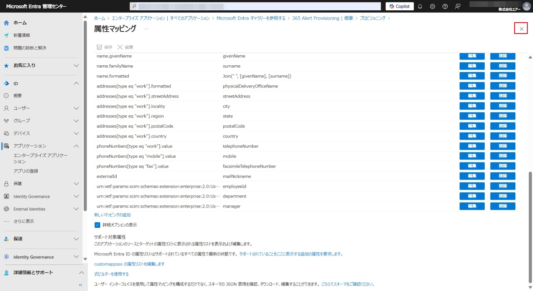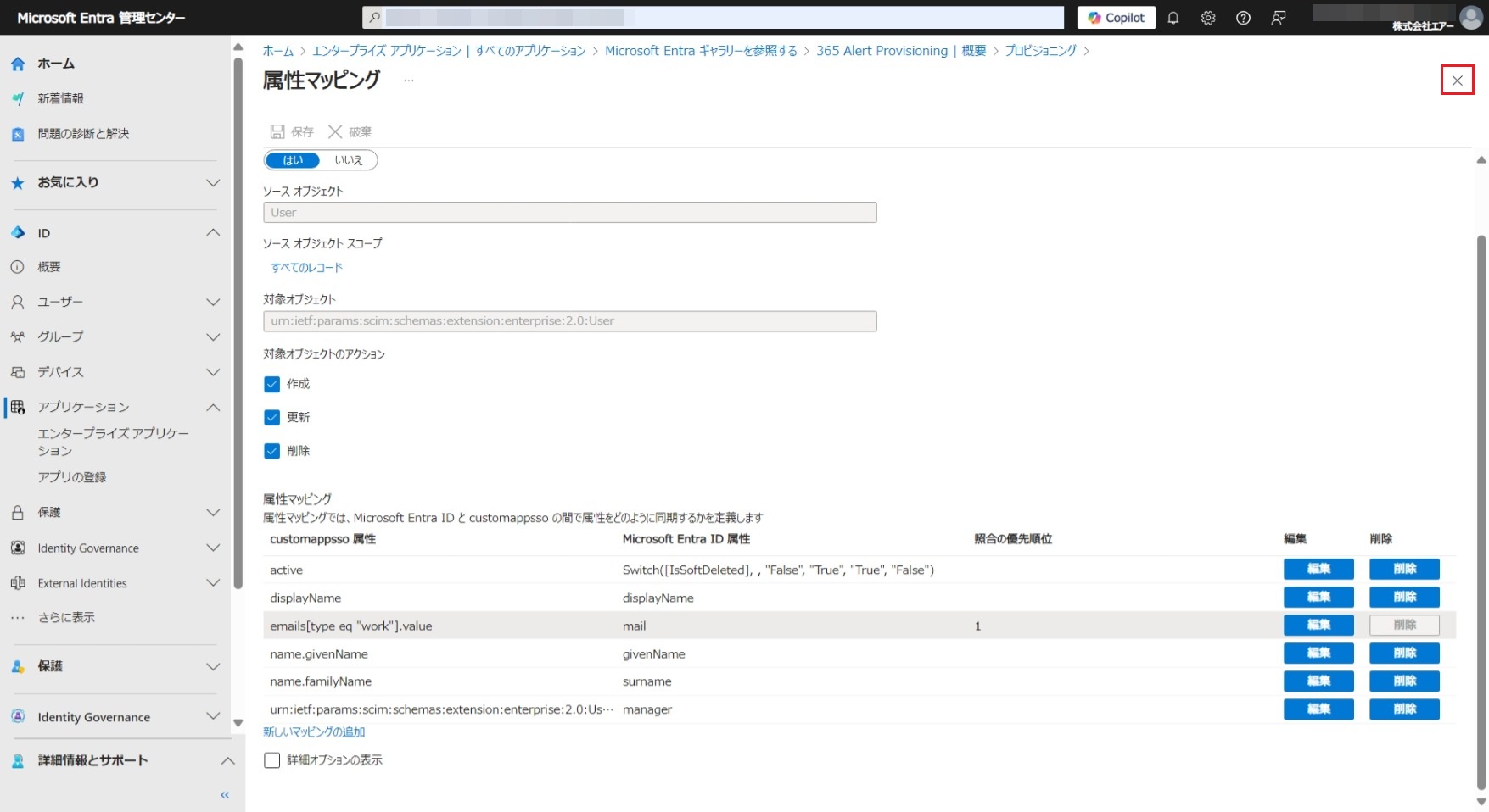 表示された[属性マッピング]画面の右上の[×]をクリックし、表示された[プロビジョニング]画面で、[マッピング]セクションの「Provision Microsoft Entra ID Users」リンクをクリックし再度[属性マッピング]画面を開きます。