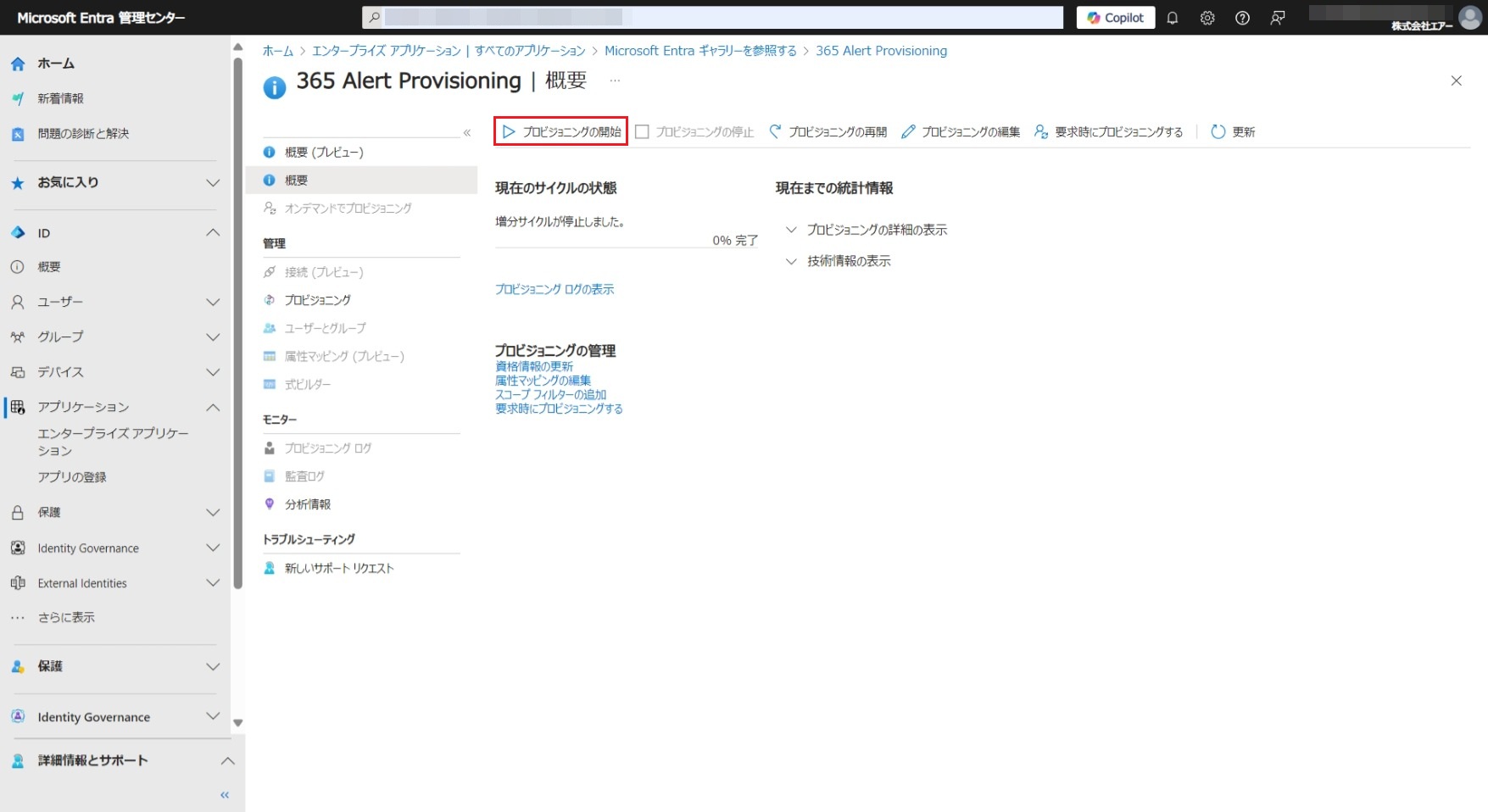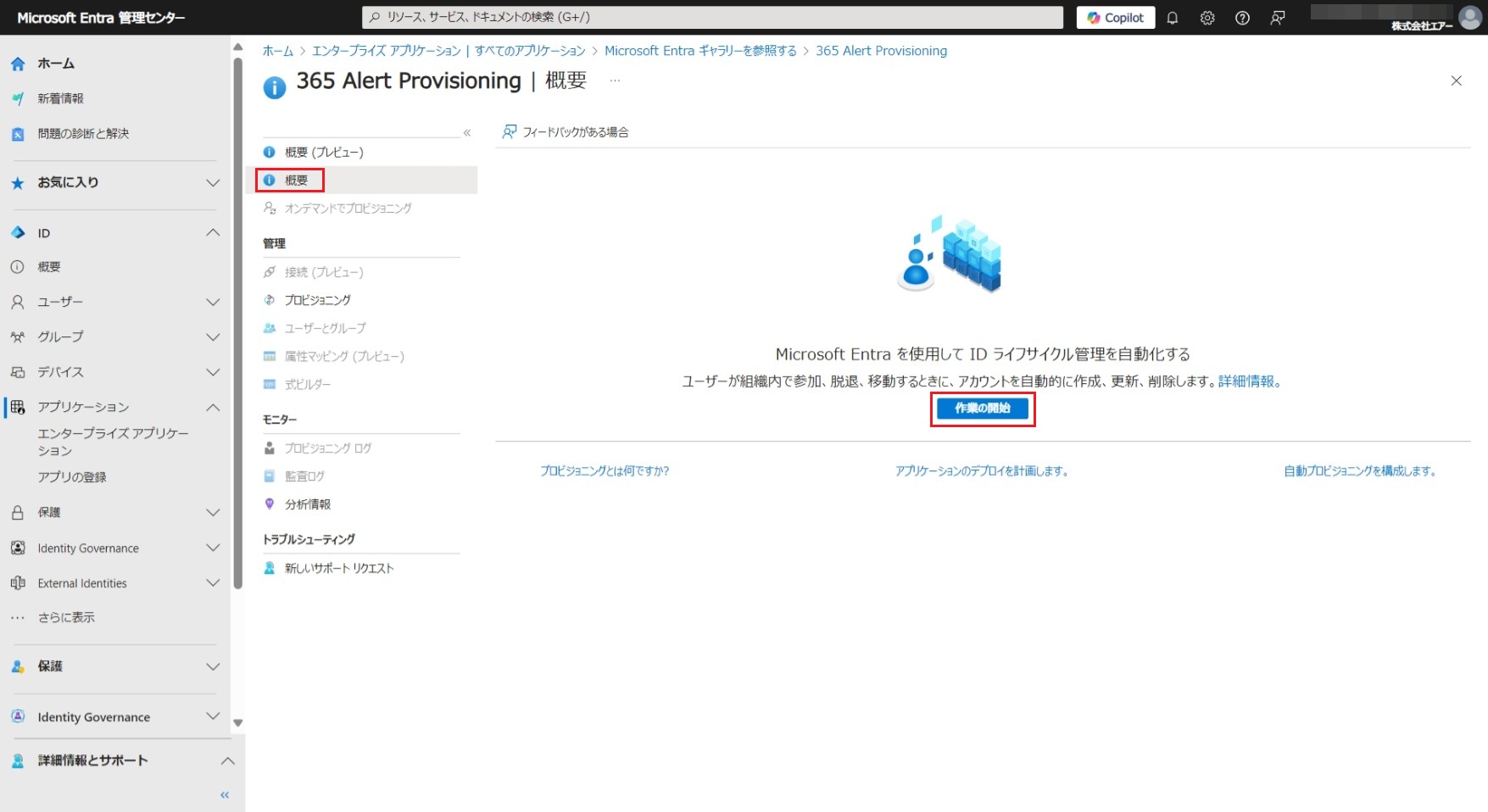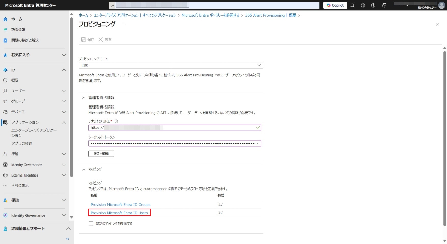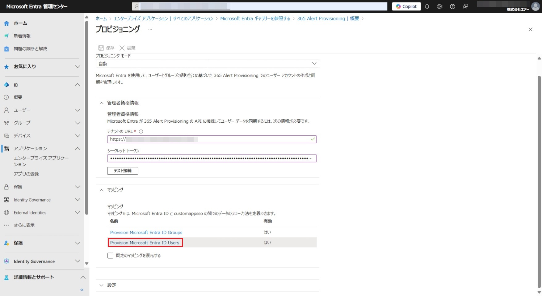 - Microsoft Entra ID(旧称Azure AD)に自動プロビジョニング用のアプリ(アプリ名は365 Alert Provisioning)を登録し、365 Alert Provisioningアプリに対する自動プロビジョニングの設定を行います。