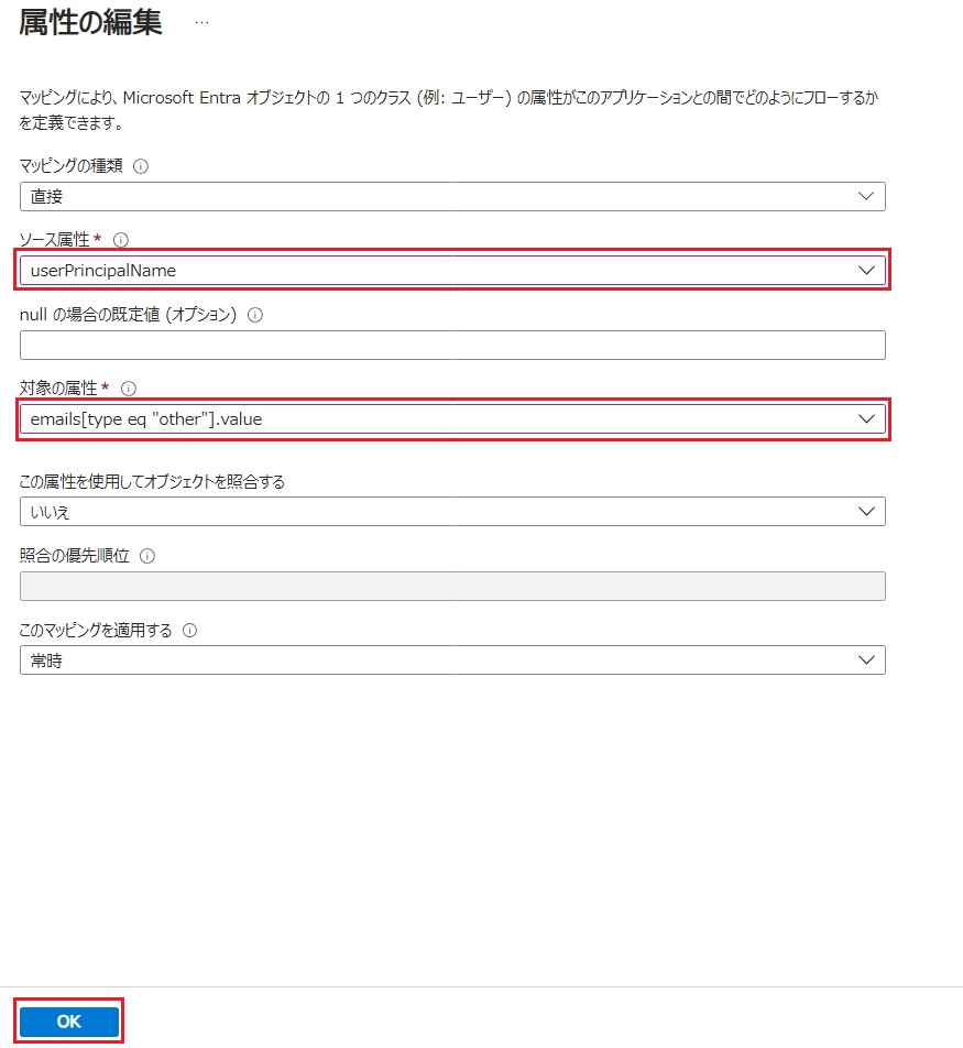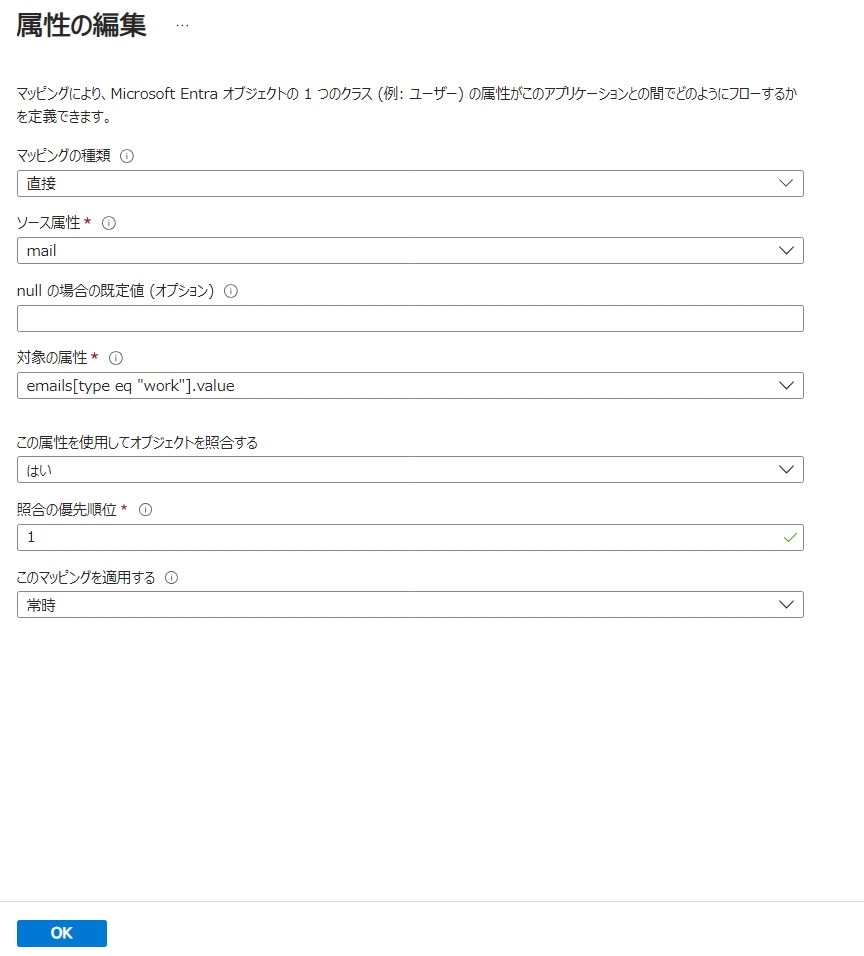 - Microsoft Entra ID 属性が「mail」の行の[編集]をクリックし以下の編集を行います。