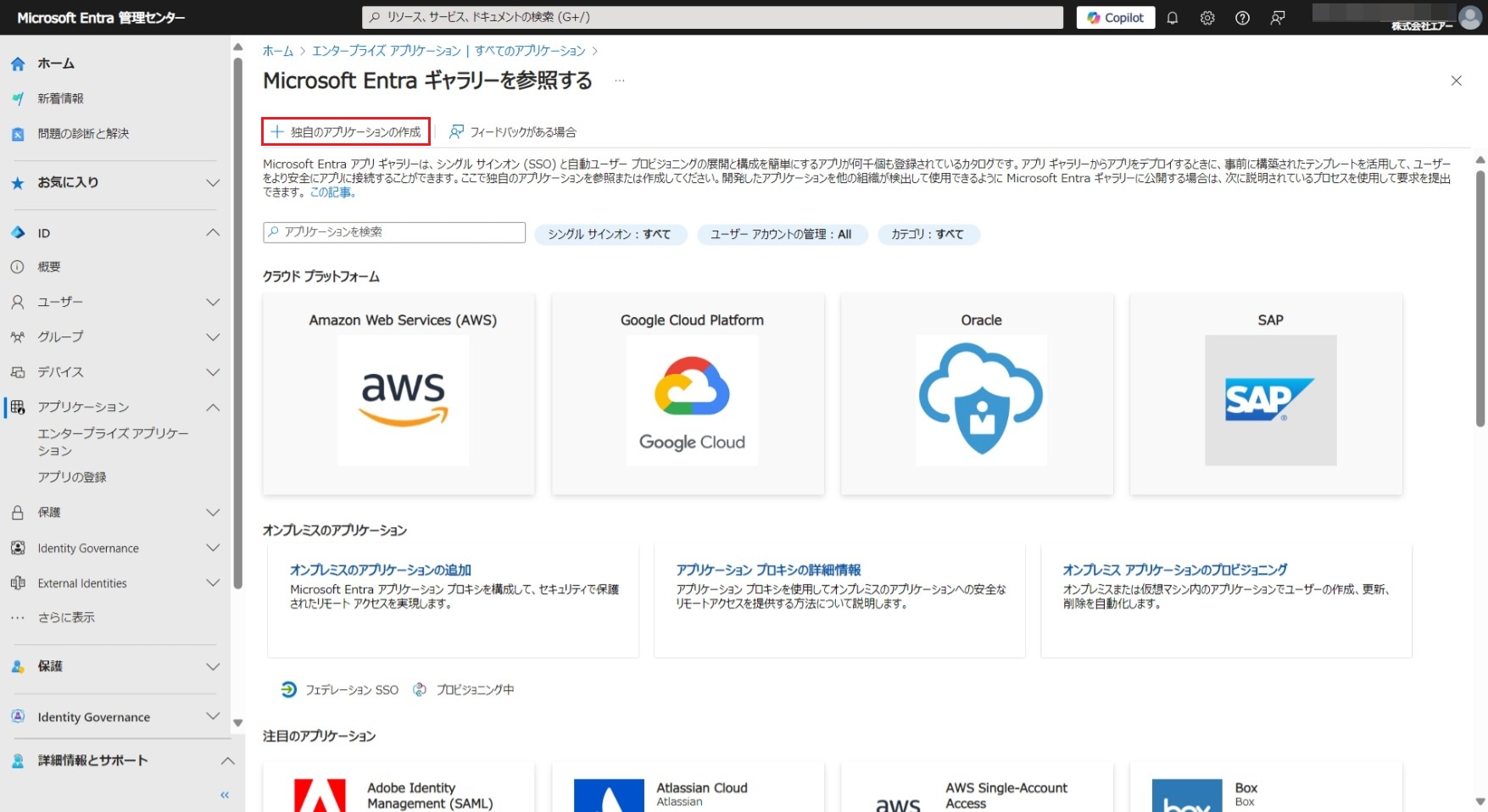 画面左のメニューから[アプリケーション]>[エンタープライズ アプリケーション]の順にクリックします。表示された画面で[管理]>[すべてのアプリケーション]をクリックし表示された画面で[+新しいアプリケーション]をクリックします。