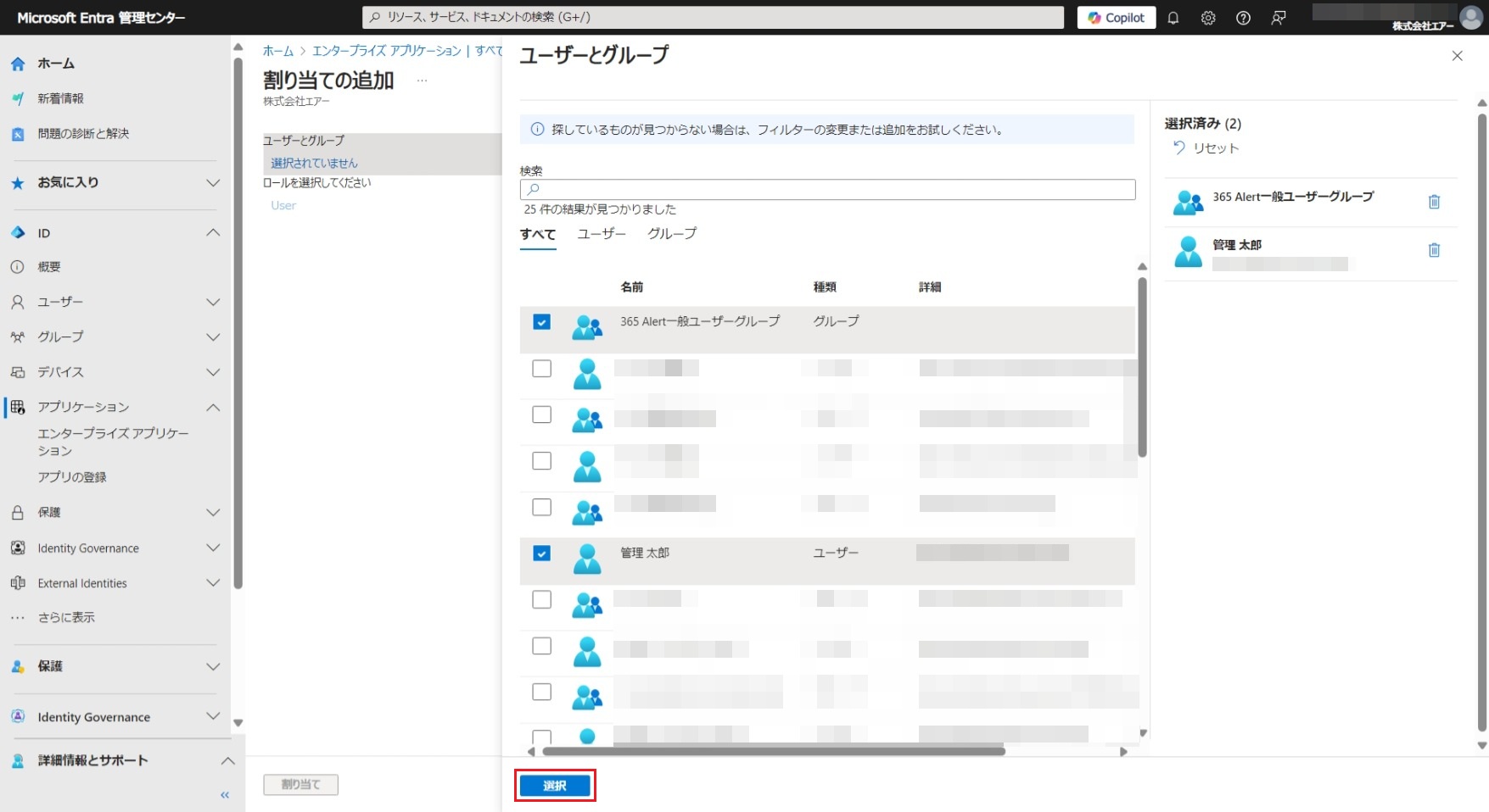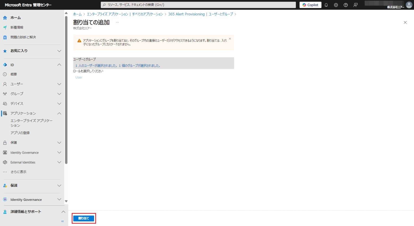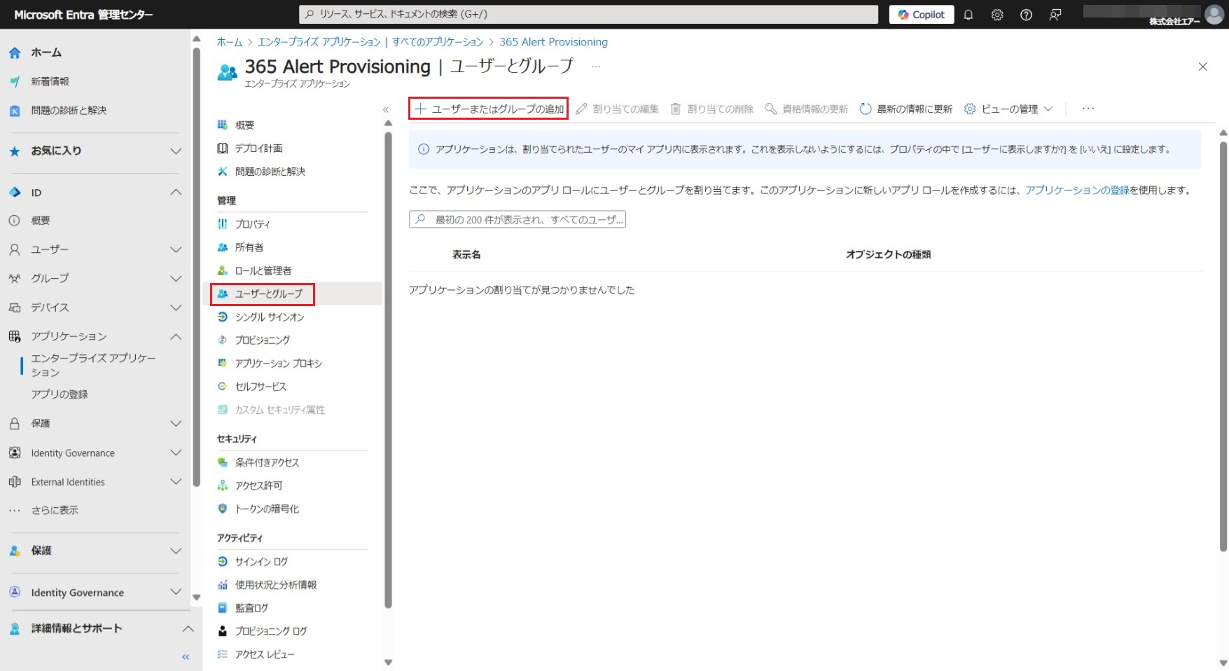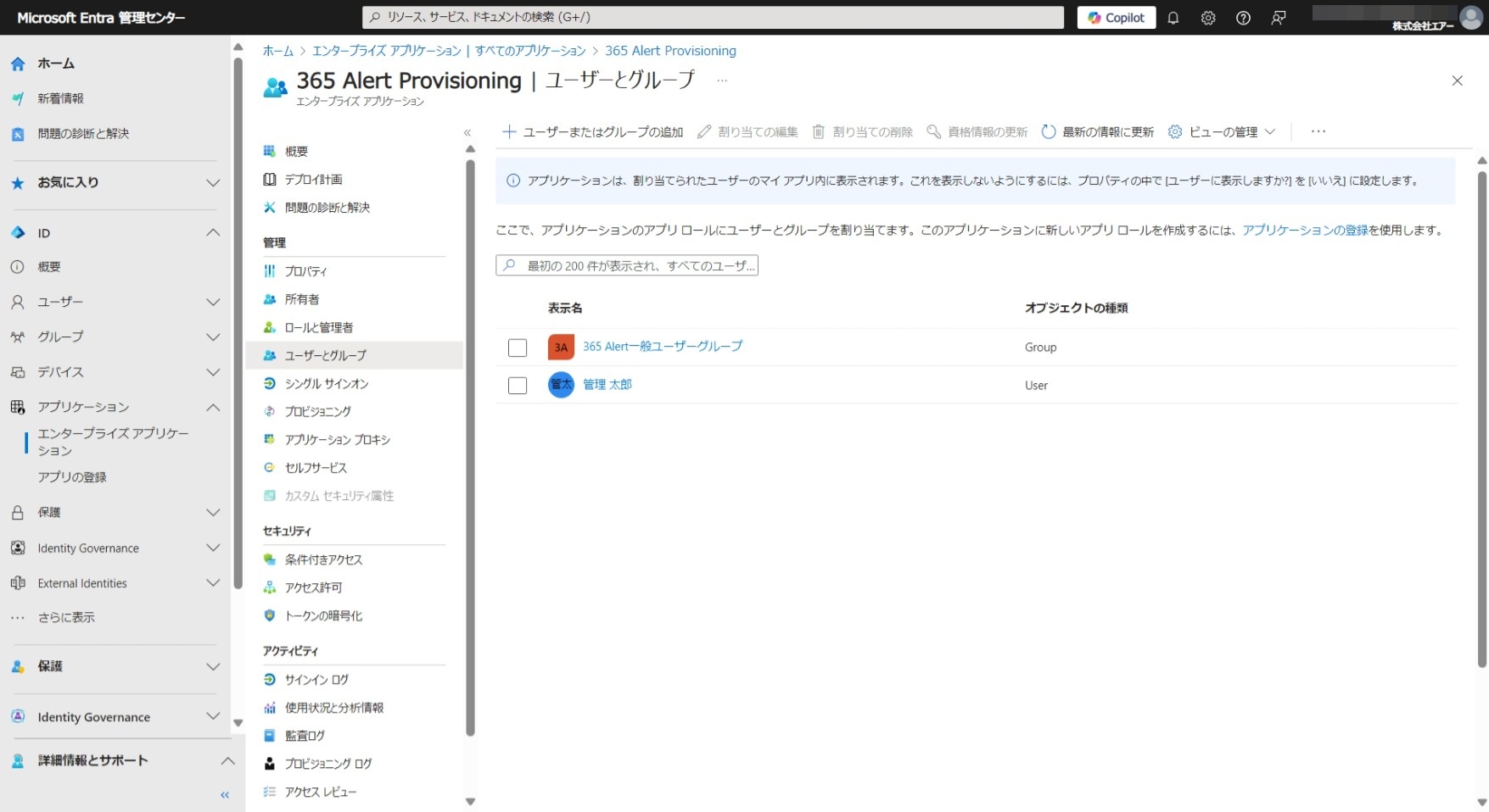 - 同期させたいユーザーとグループを365 Alert Provisioningアプリに割り当て、自動プロビジョニングの対象とします。