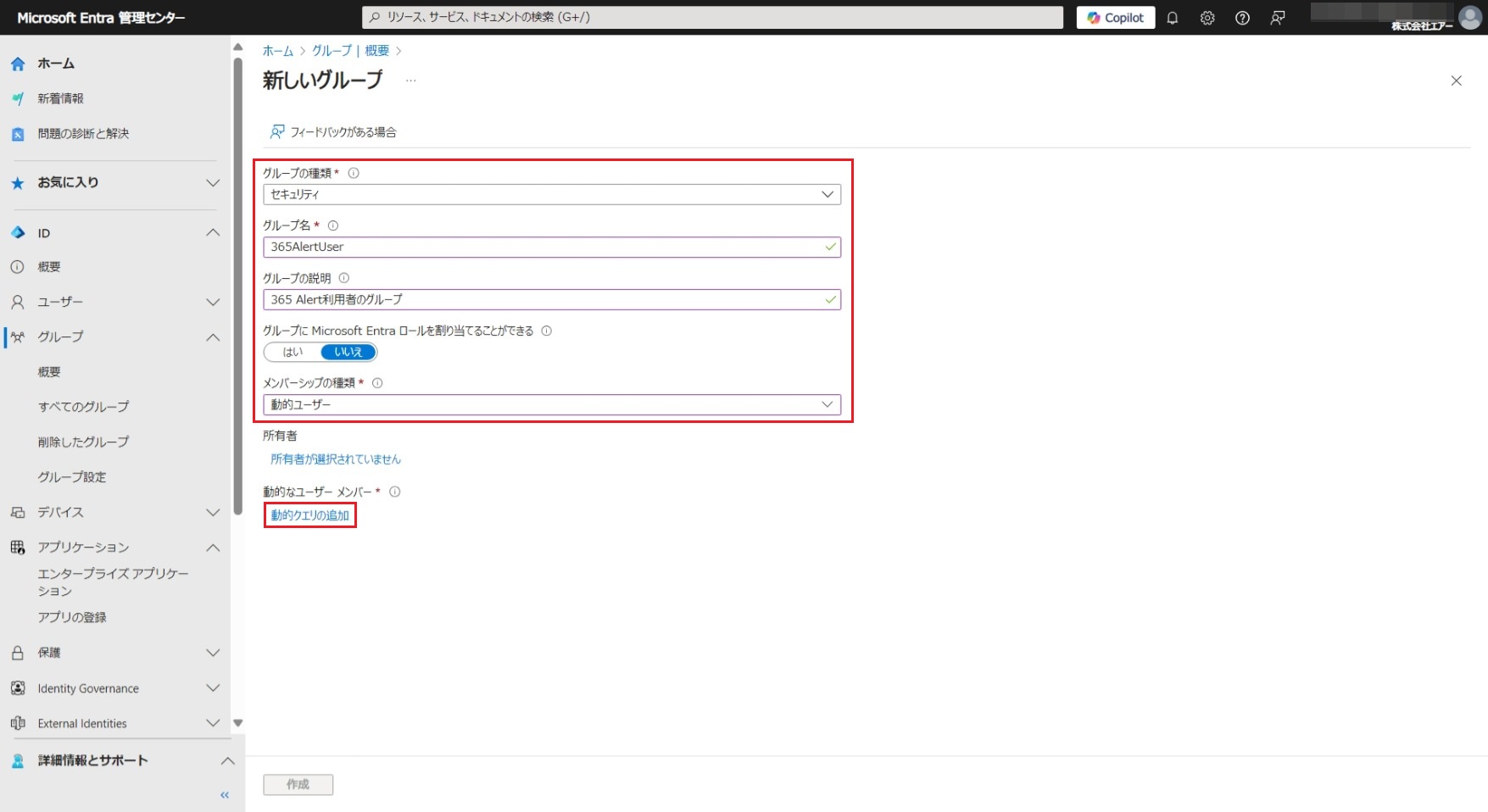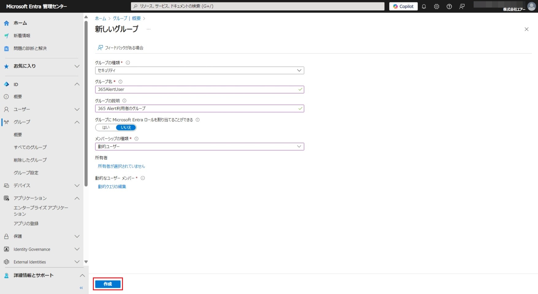 項目 設定値 グループの種類 セキュリティ グループの説明 <任意のグループの説明> グループに Microsoft Entra ロールを割り当てることができる いいえ グループ名 <任意のグループ名> メンバーシップの種類 動的ユーザー
