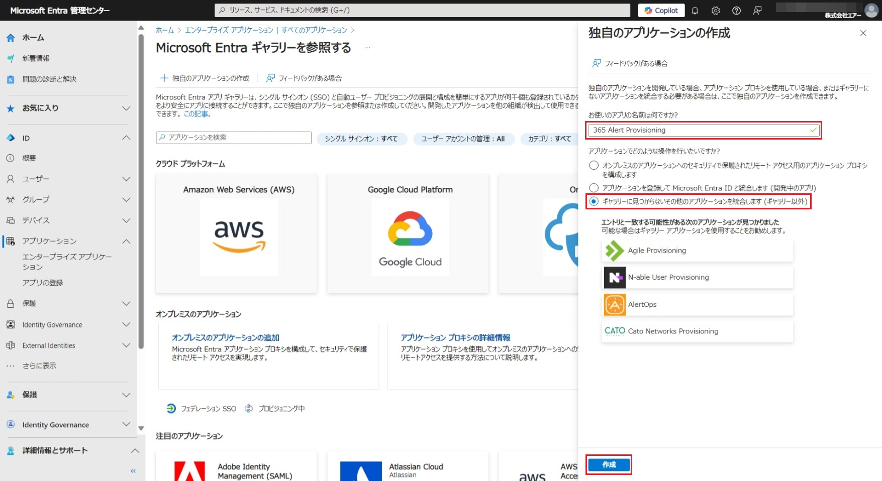以下画面で、アプリケーションの名前に「365 Alert Provisioning」と入力し、[ギャラリーに見つからないその他のアプリケーションを統合します (ギャラリー以外)]オプションを選択して、[作成]をクリックします。