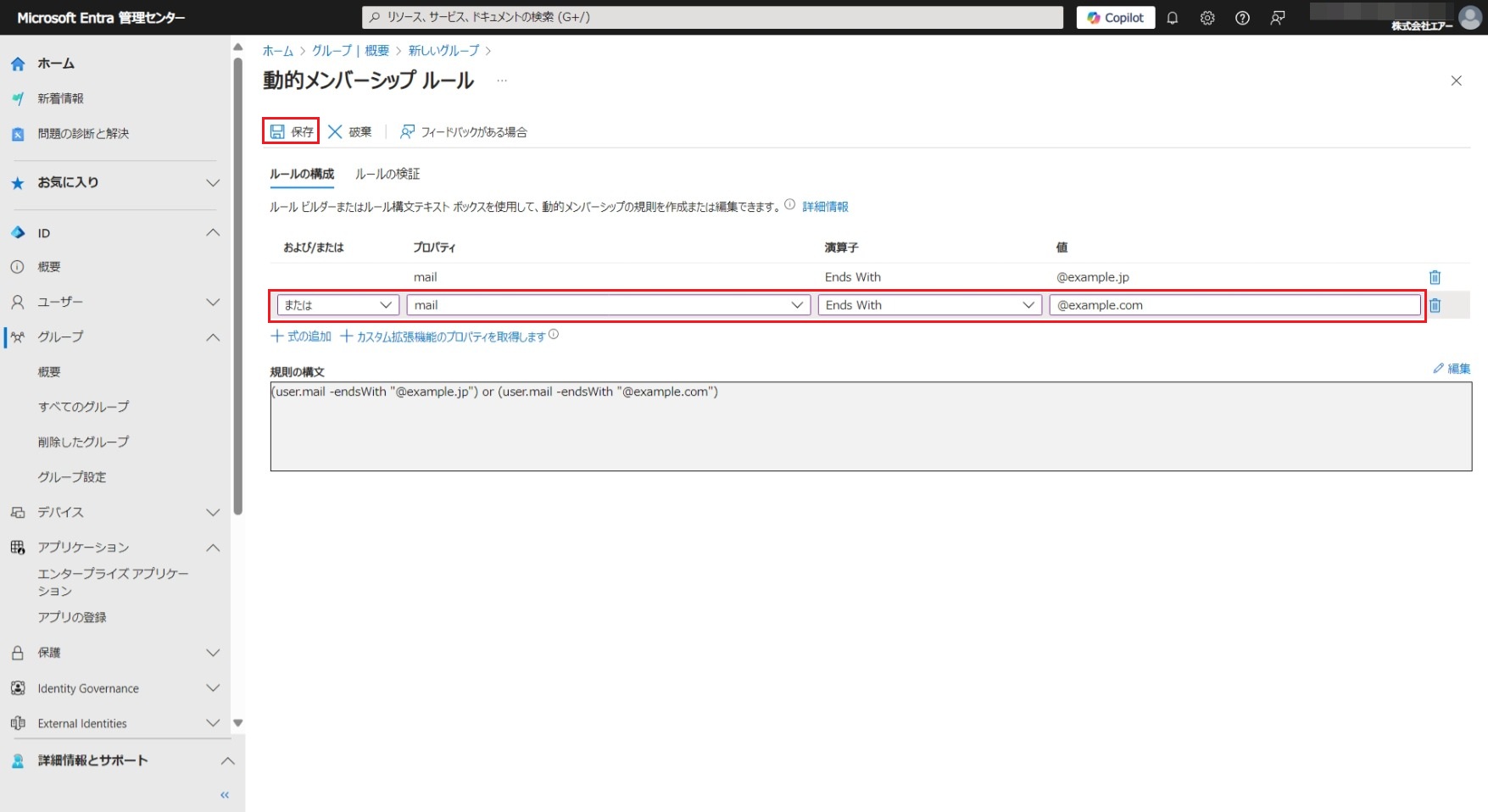 例えば、テナント管理者admin@example.jpとadmin@example.comを動的グループから除外する場合は[規則の構文]の[編集]リンクをクリックして、下記の規則を記入してください。((user.mail -endsWith "@example.jp") or (user.mail -endsWith "@example.com")) and (user.mail -ne "admin@example.jp") and (user.mail -ne "admin@example.com") -
