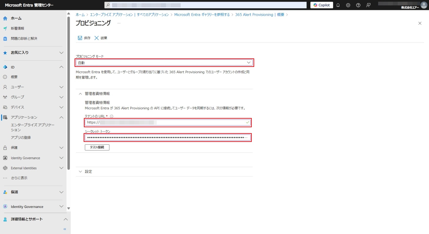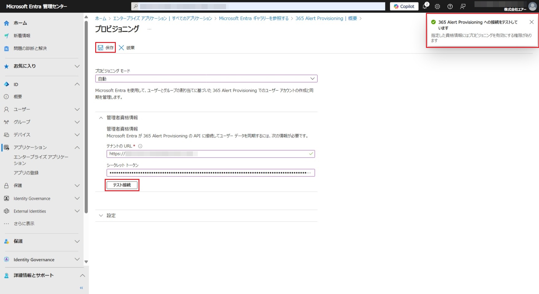 [テスト接続]をクリックします。Microsoft Entra ID(旧称Azure AD)が365 Alert Provisioningアプリへの接続をテストします。