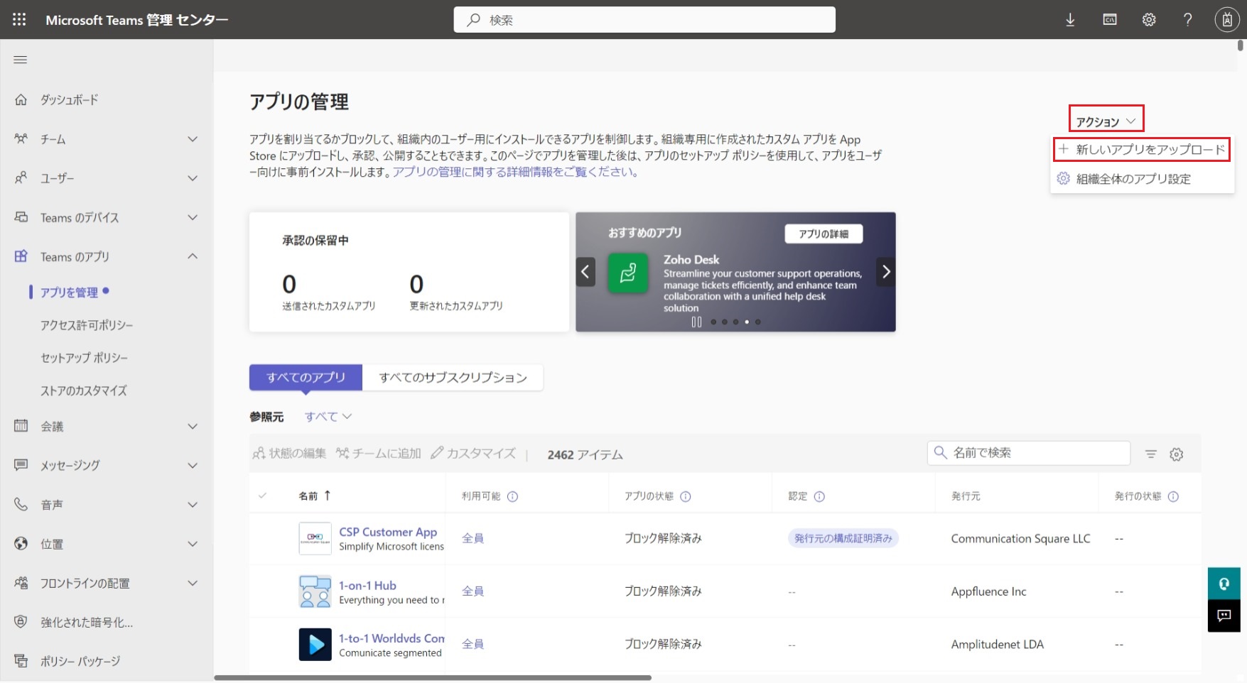 ユーザーがTeams通知を受け取るためのアプリをインストール出来るように、Microsoft Teams管理センターで365 Alertアプリのアップロードを行います。
