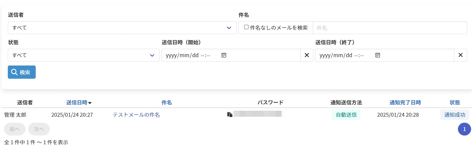 | 通知完了日時 | 対象メールの暗号化パスワード通知が完了した日時です。 |