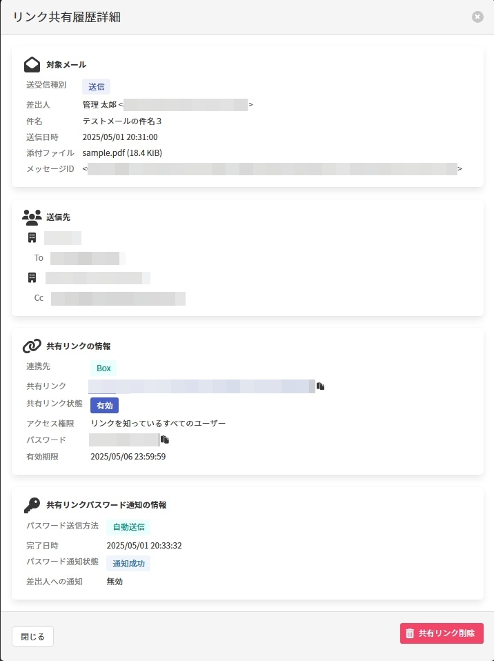 管理ポータル各種履歴確認リンク共有履歴リンク共有履歴の確認On this pageリンク共有履歴の確認概要 リンク共有履歴の確認は、リンク共有履歴詳細画面で行います。 リンク共有履歴詳細画面へのアクセス方法