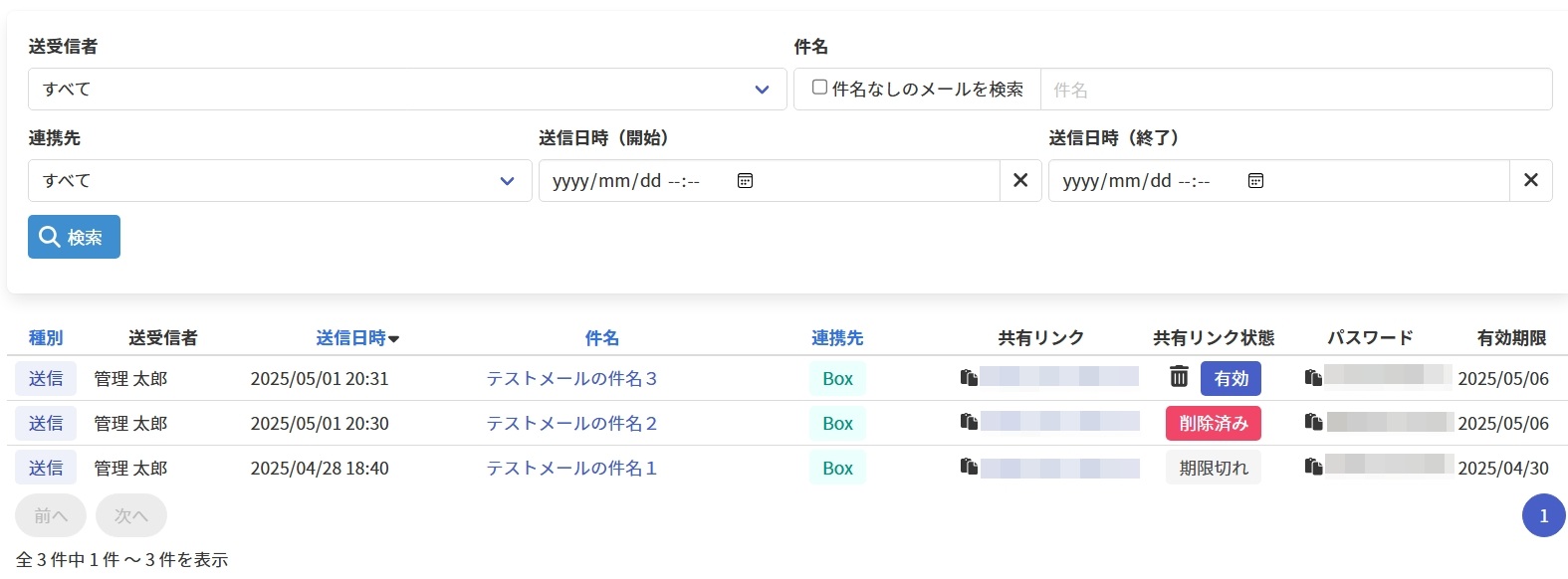 管理ポータル各種履歴確認リンク共有履歴リンク共有履歴画面とはOn this pageリンク共有履歴画面とはtip履歴に関する各種上限値についてはこちらを参照してください。 概要 リンク共有履歴画面では、送信者(送信メールの場合)または受信者(受信メールの場合)がサインインユーザーまたは代理操作対象のリンク共有履歴が確認できます。 リンク共有履歴画面へのアクセス方法 管理ポータルの画面左のメニューの[履歴]>[リンク共有履歴]をクリックします。 リンク共有履歴画面 リンク共有履歴一覧の項目