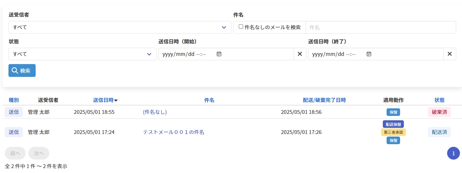 メール配送履歴画面では、送信者(送信メールの場合)または受信者(受信メールの場合)がサインインユーザーまたは代理操作対象のメール配送履歴が確認できます。