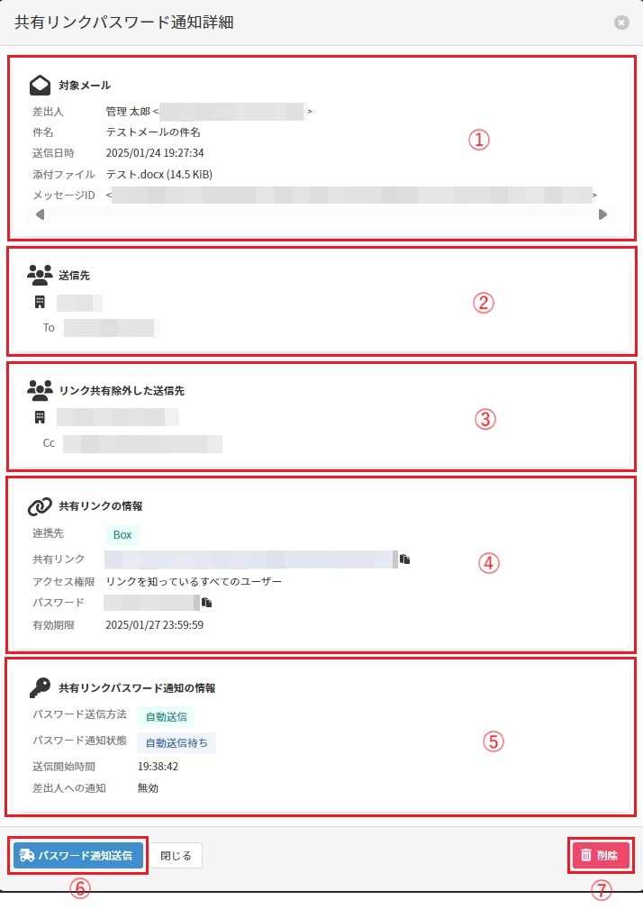 | ⑤ | パスワード通知送信ボタン | クリックすると共有リンクパスワード通知が送信されます。 |