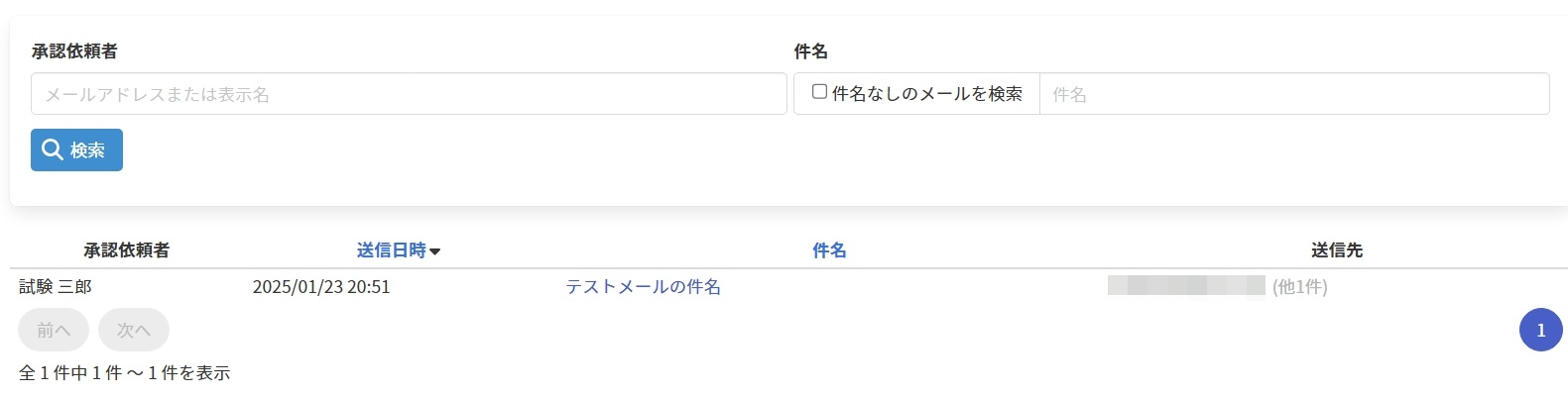 | 送信先 | メールの送信先メールアドレスです。 複数件存在する場合は最初の1件のメールアドレスと残りの件数を表示します。 |