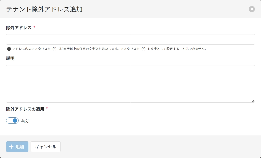 管理ポータル各種設定内部ドメイン除外アドレスを追加するOn this page除外アドレスを追加する以下では、内部ドメイン画面からアクセス可能な除外アドレス追加画面で可能な操作について記載します。 除外アドレス追加画面 除外アドレスの追加 除外アドレス追加画面で以下の項目を入力し、[追加]をクリックして除外アドレスを追加します。 項目名説明除外アドレス必須こちらを参照して除外アドレスを指定します。説明こちらを参照して説明を指定します。除外アドレスの適用必須除外アドレス追加後に除外アドレスを有効化するか否かを指定します。