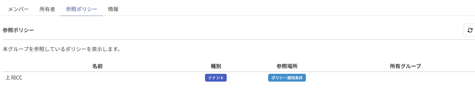 | 3 | 参照場所 | グループを参照しているポリシーの項目です。以下の項目があります。 ポリシー適用グループ ポリシー適用除外グループ ポリシー適用条件 ポリシー適用除外条件 |