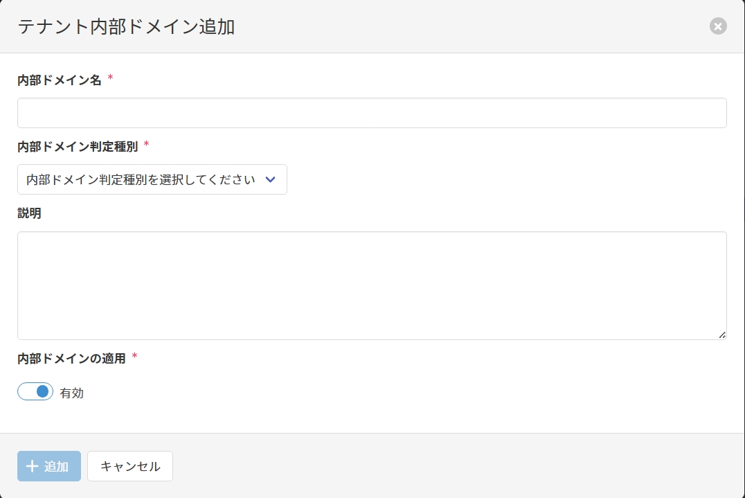 | 内部ドメインの適用必須 | 内部ドメイン追加後に内部ドメインを有効化するか否かを指定します。 |