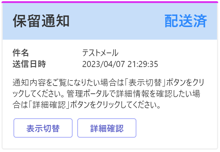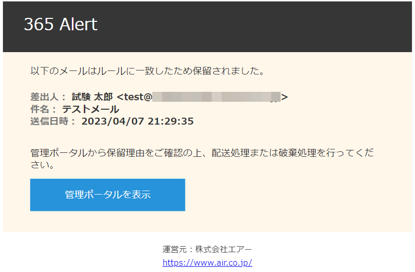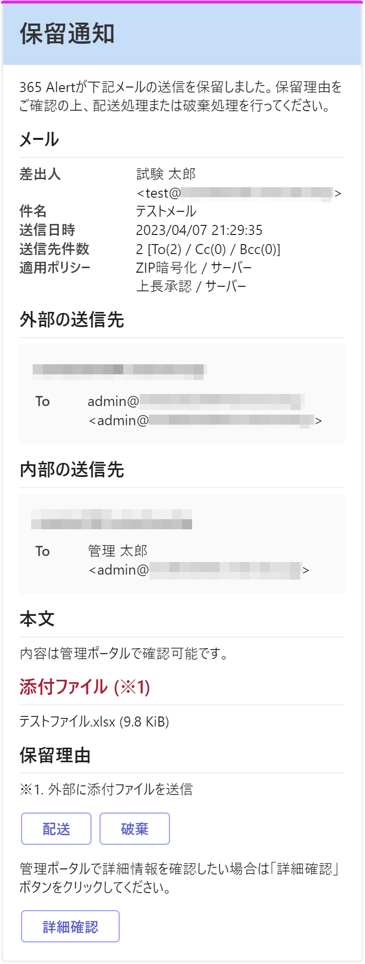 | 操作 | 本文内の管理ポータルを表示ボタンをクリックすると、ブラウザで管理ポータルの保留メール詳細画面が開きます。メールが既に配送・破棄済みの場合はメール配送履歴詳細画面が開きます。 |