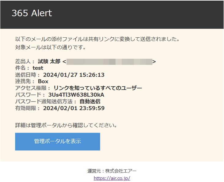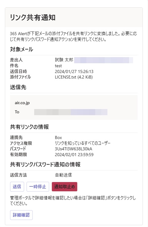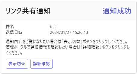 | 操作 | 本文内の管理ポータルを表示ボタンをクリックすると、ブラウザで管理ポータルの共有リンクパスワード通知詳細画面が開きます。共有リンクパスワード通知が既に送信・通知取止め済みの場合はリンク共有履歴詳細画面が開きます。 |