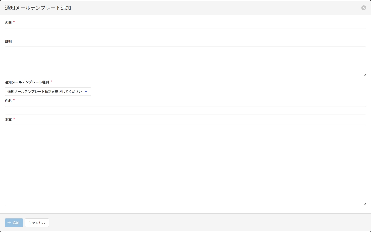 通知メールテンプレート追加画面で以下の項目を入力し、[追加]をクリックして通知メールテンプレートを追加します。