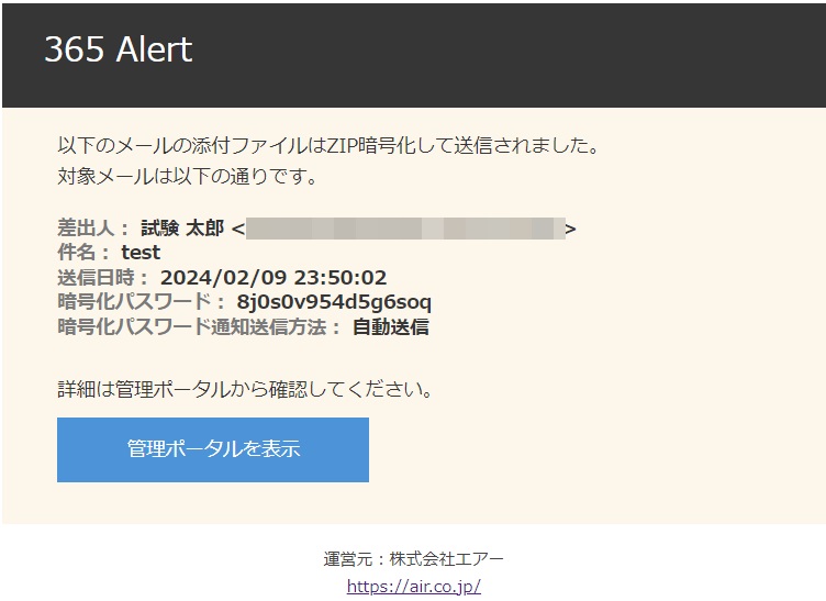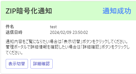 | 操作 | 本文内の管理ポータルを表示ボタンをクリックすると、ブラウザで管理ポータルの暗号化パスワード通知詳細画面が開きます。暗号化パスワード通知が送信・削除済みの場合は暗号化パスワード履歴詳細画面が開きます。 |