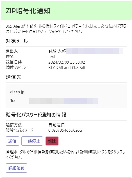 暗号化パスワード通知が送信もしくは削除されると、Teams通知が以下の内容に更新されます。