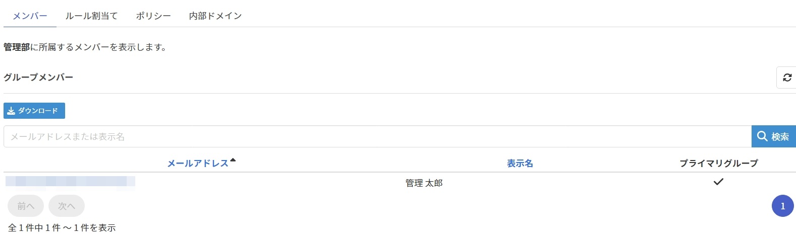 検索ボックスにキーワードを入力し[検索]をクリックすると、メールアドレスまたは表示名に部分一致するグループメンバーのみをフィルタリングすることができます。