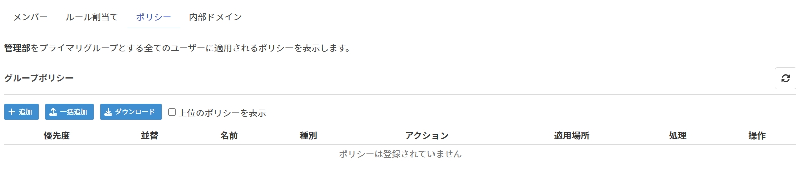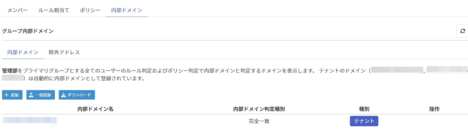 グループ内部ドメインの確認・追加・更新・削除ができます。