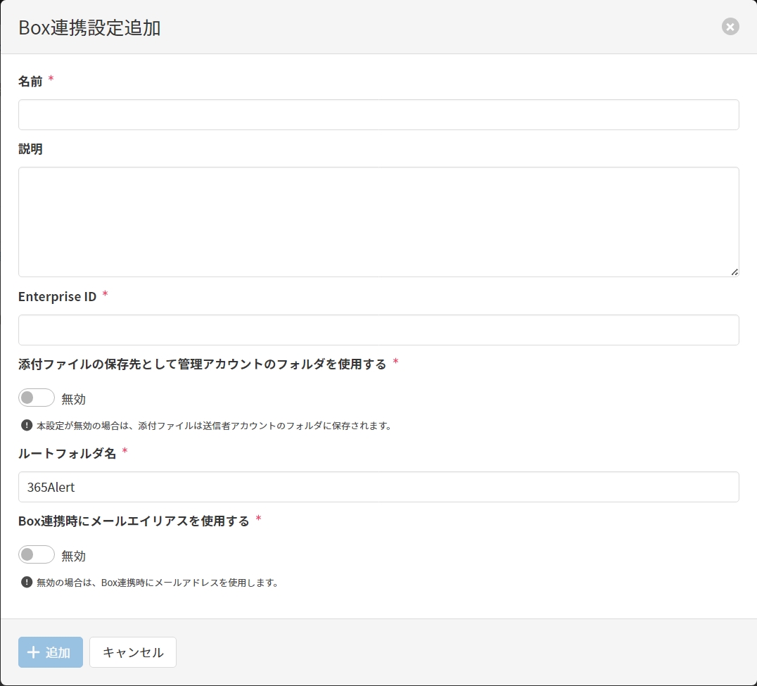 Box連携設定追加画面で以下の項目を入力し、[追加]をクリックしてBox連携設定を追加します。