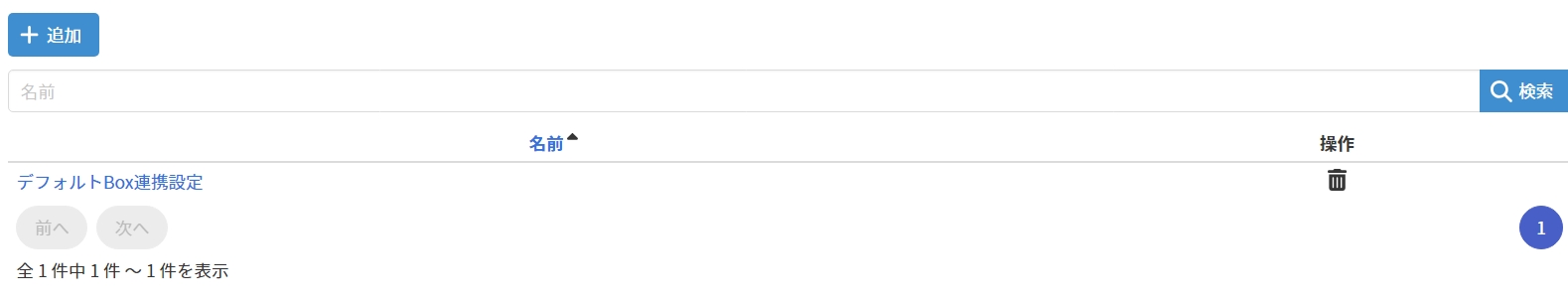 検索ボックスにキーワードを入力し[検索]をクリックすると、名前に部分一致するBox連携設定のみをフィルタリングすることができます。