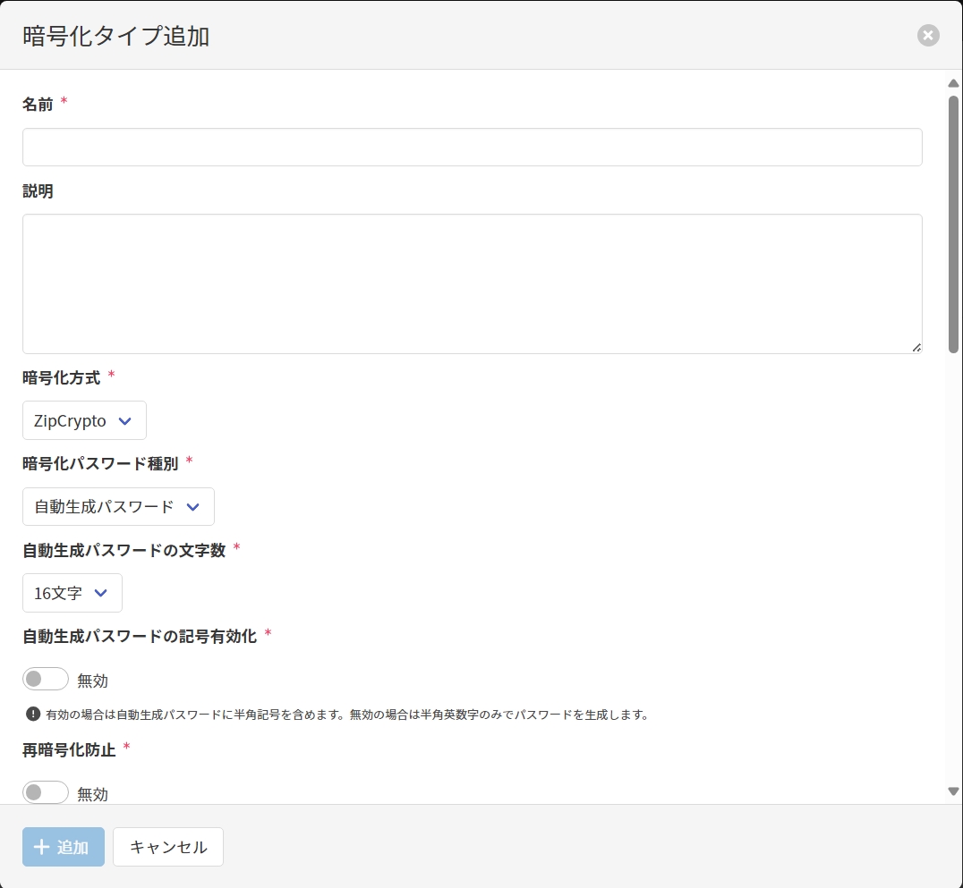 暗号化タイプ追加画面で以下の項目を入力し、[追加]をクリックして暗号化タイプを追加します。