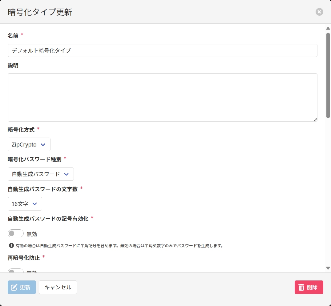 暗号化タイプ更新画面で以下の項目を入力し、[更新]をクリックして暗号化タイプを更新します。